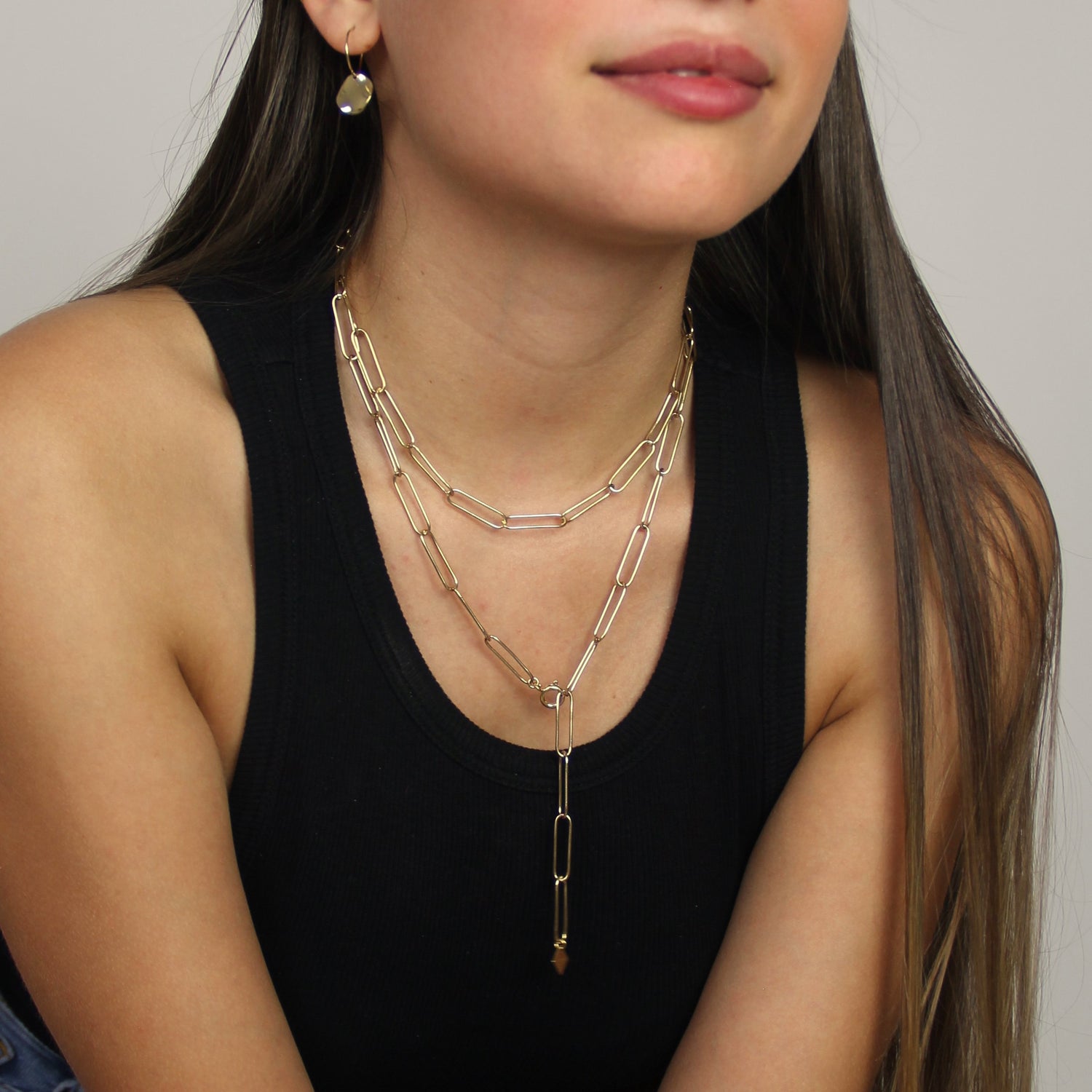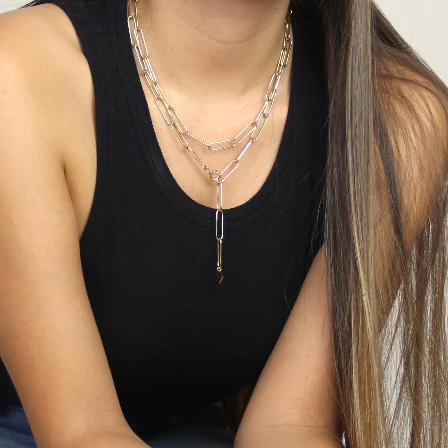 Introducing the Adepte Lou Chain Necklace, a veritable chameleon in your jewelry box. This 18k gold-plated necklace redefines versatility, offering multiple wearing options from a simple layer jumper to an intricate two-layer tie necklace. At an impressive length of 35.4", it can be styled to suit any neckline, outfit, or occasion. The elongated links provide a contemporary yet timeless feel, while the gold plating ensures enduring beauty. Handcrafted with the finesse synonymous with Toulouse's renowned workshops, the Lou necklace is an embodiment of the creative spirit and elegance of Adepte.