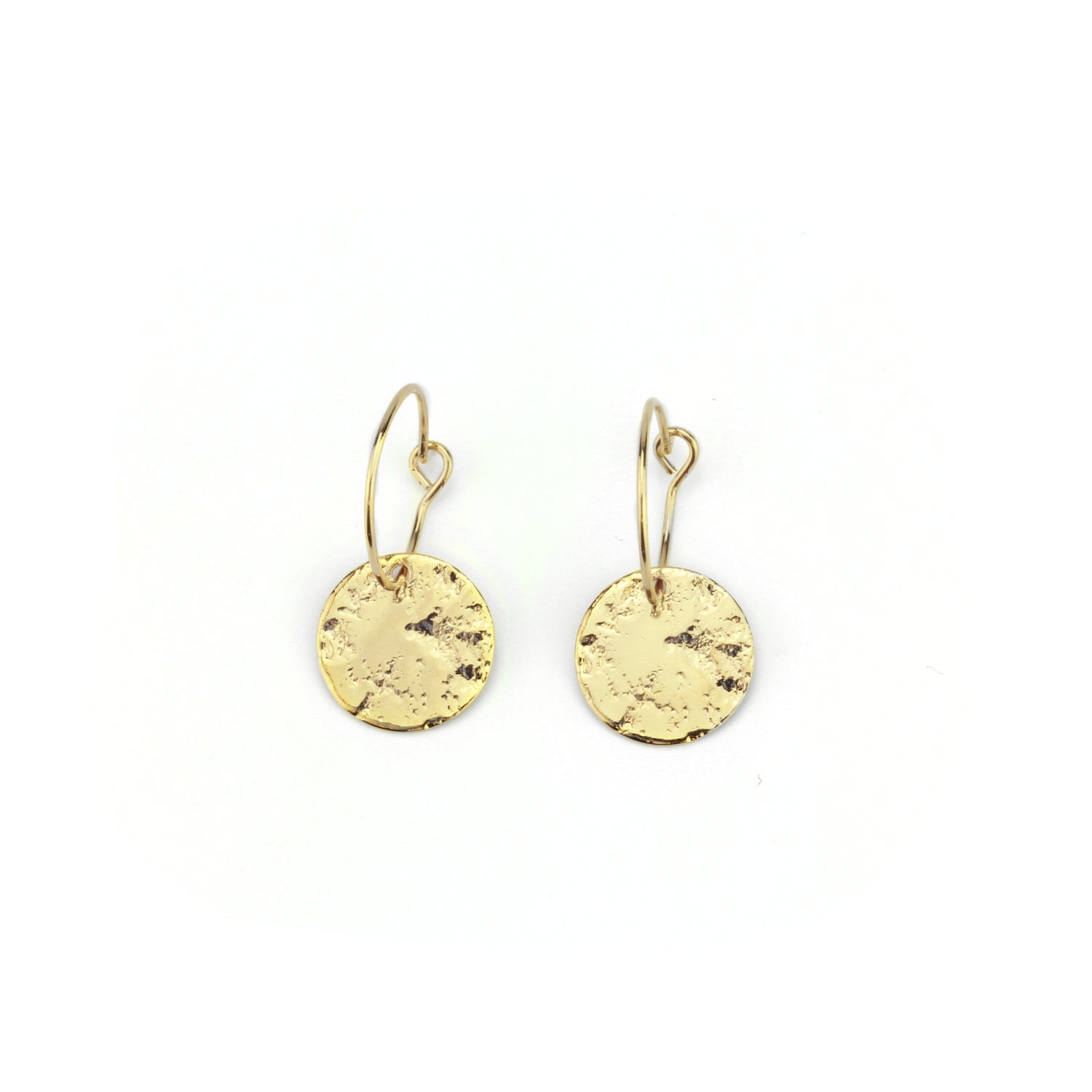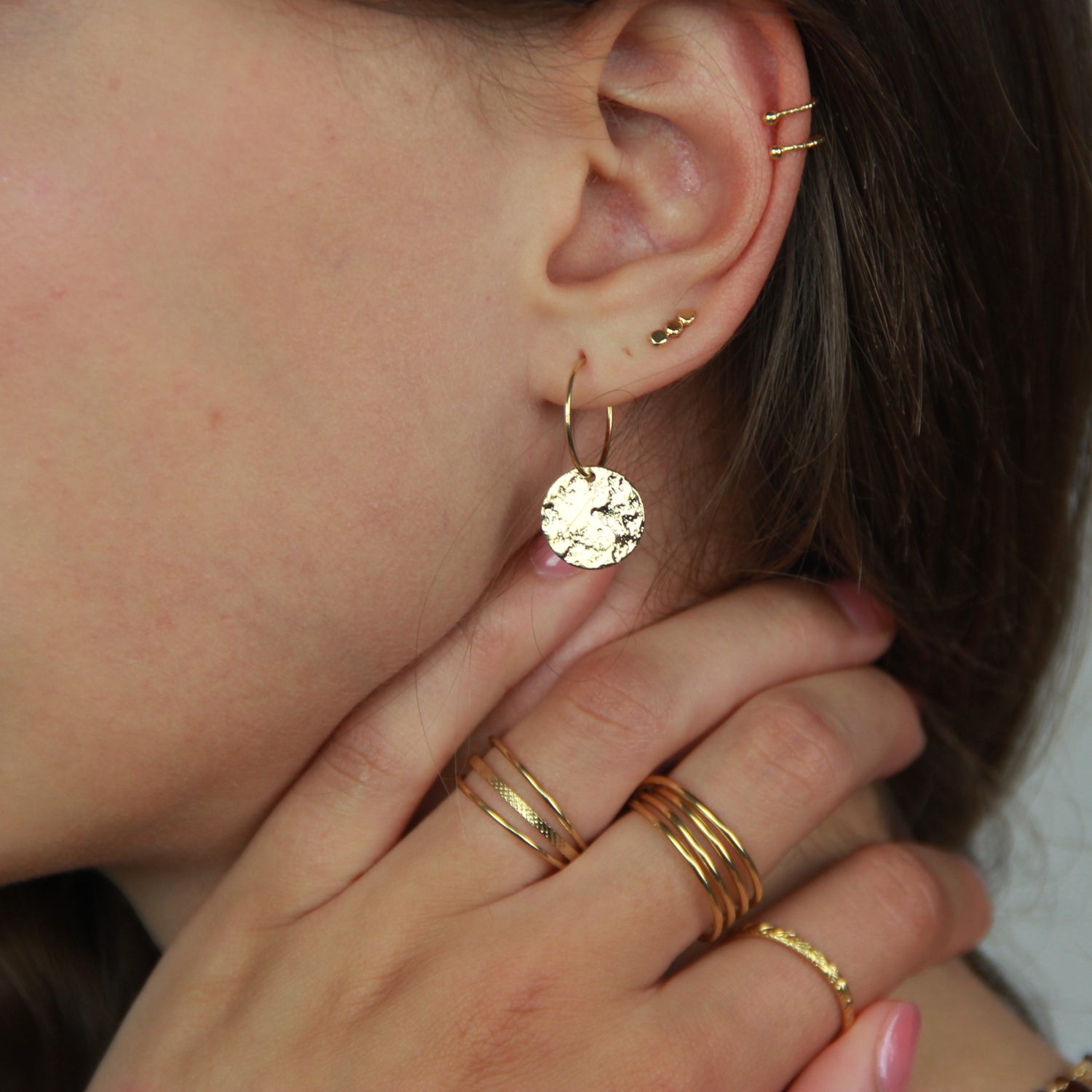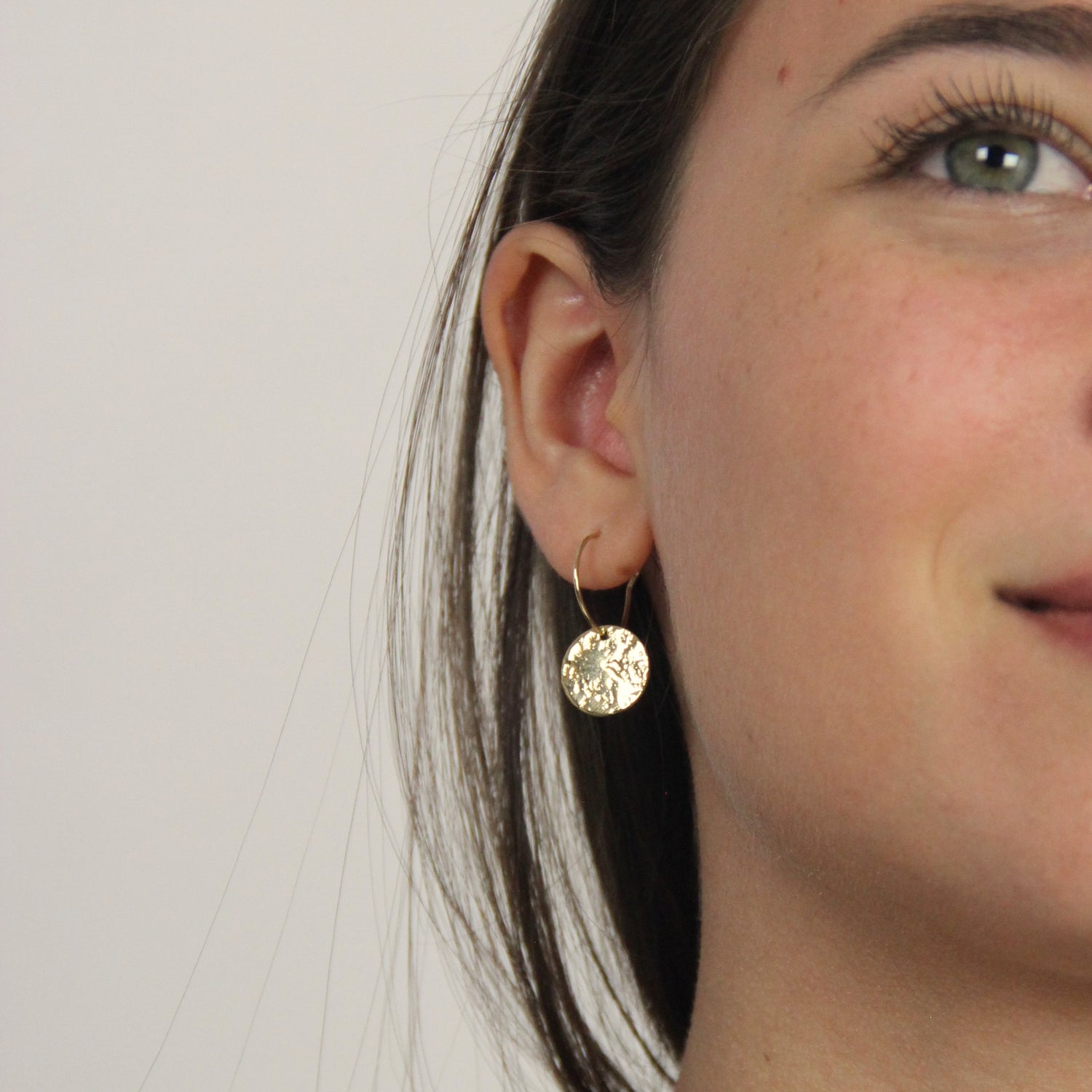 Adorn yourself with the celestial charm of the Adepte Moon Medium Hoop Earrings, where the mystique of lunar textures meets the glow of 18k gold plating. Each earring features a 0.52" diameter medal that captures the cratered surface of the moon, suspended from a 0.6" hoop that provides a comfortable, secure fit. These earrings are handcrafted in our Toulouse workshop, embodying the romanticism of the night sky and the artisanal spirit of Southern France. They're a sublime addition for anyone looking to bring a touch of the cosmos to their curated jewelry collection.
