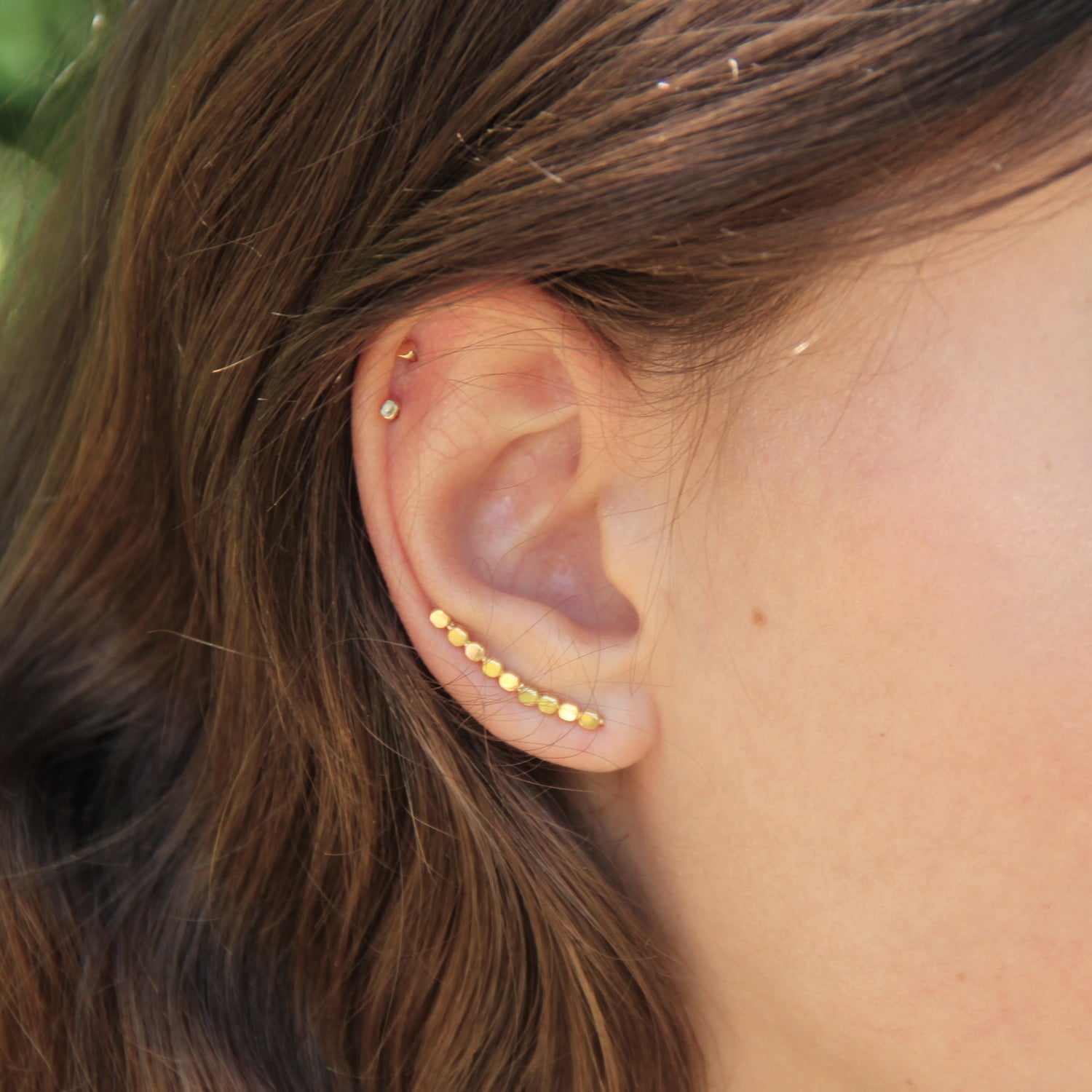 Ascend to new heights of style with Adepte's Nugget Climber Earrings, a modern twist on classic elegance. These 18k gold-plated climbers, measuring 0.80" in length, are adorned with a series of small nuggets that curve gracefully along the contour of your ear. Each nugget catches the light, creating a subtle yet captivating sparkle that's perfect for both casual and dressier occasions. Handcrafted with care in our Toulouse atelier, these earrings showcase the finesse of French jewelry artistry and Adepte’s dedication to innovative design.