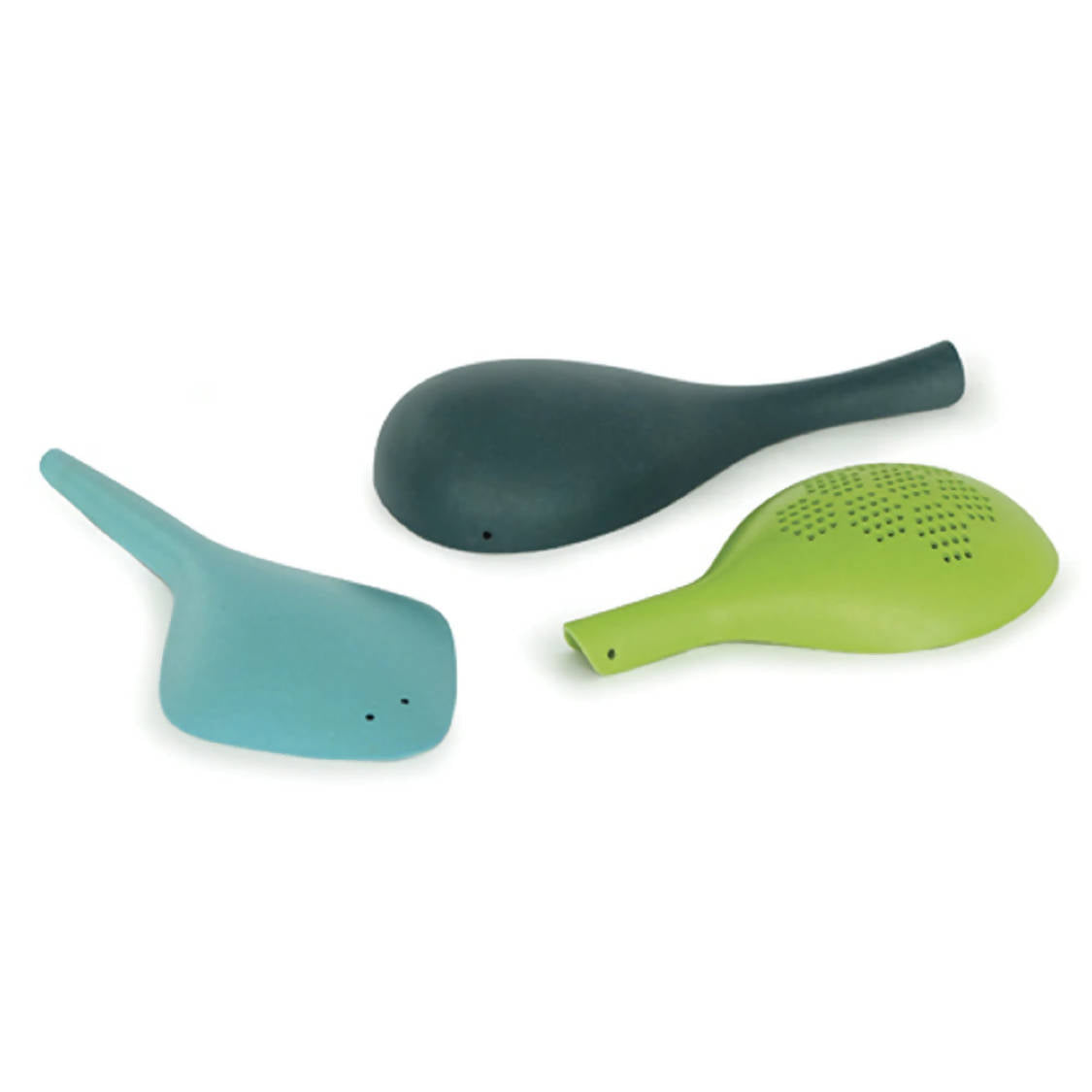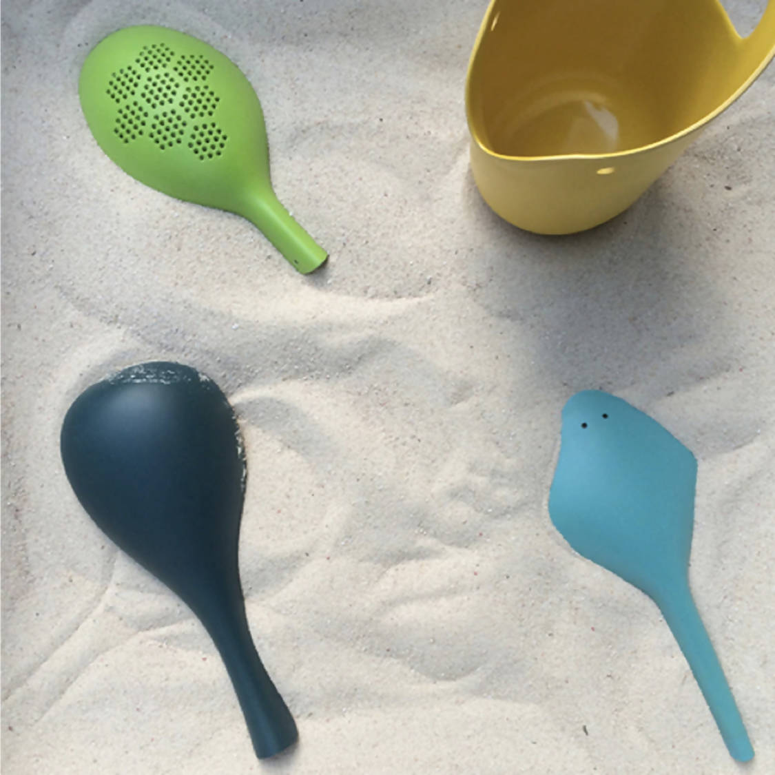 Bamboo fibre sand play set is as resistant as plastic or melamine, without taking any risk for your health and the environment. This 3-piece set consists of a Manta shovel (Ray), a Turtle Sifter (Shelley) and a Whale Scoop (Moby). The poetic animal forms will endear parents and delight children.