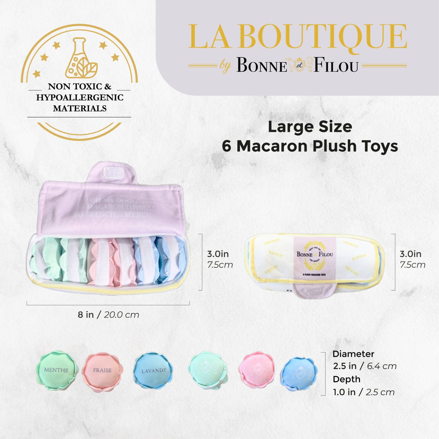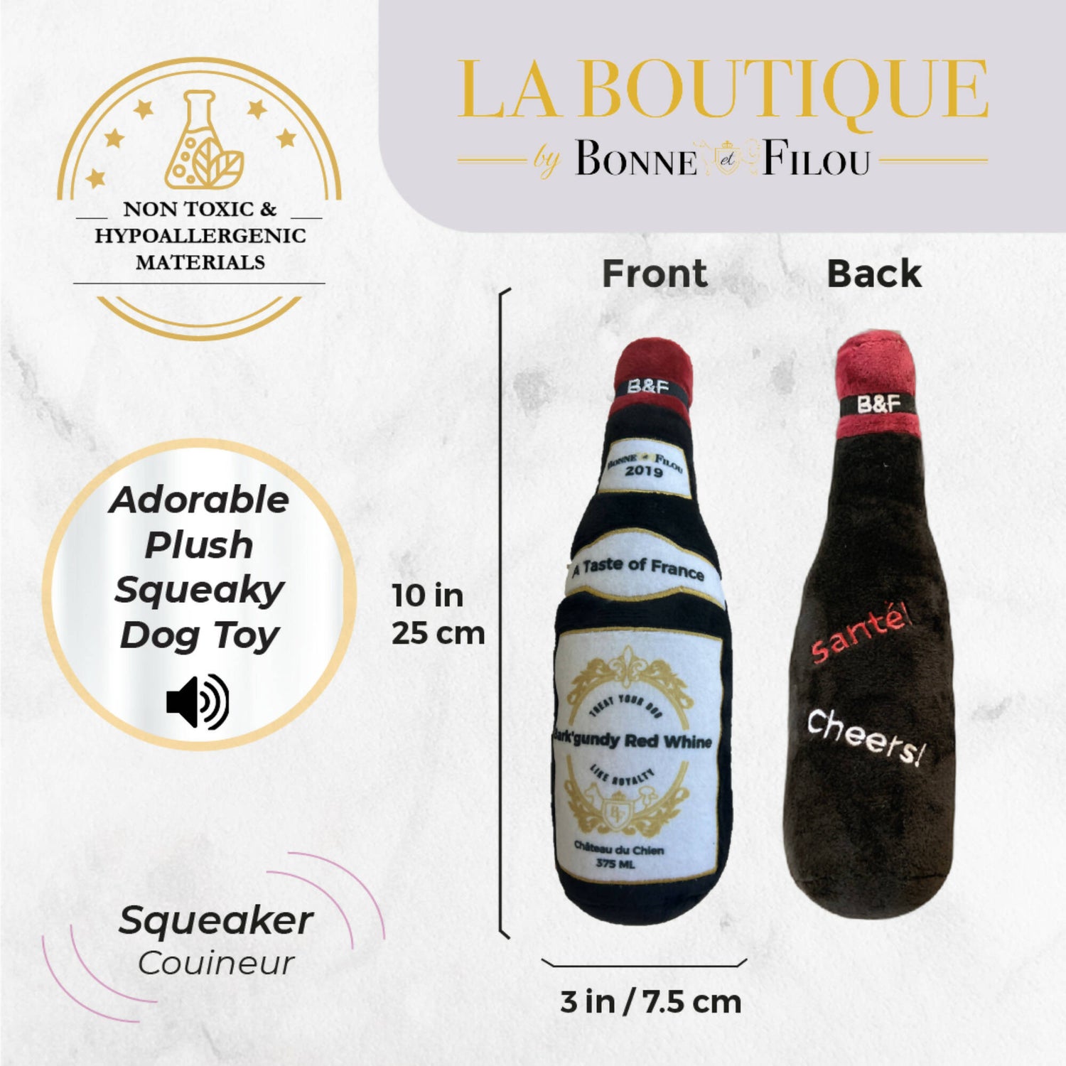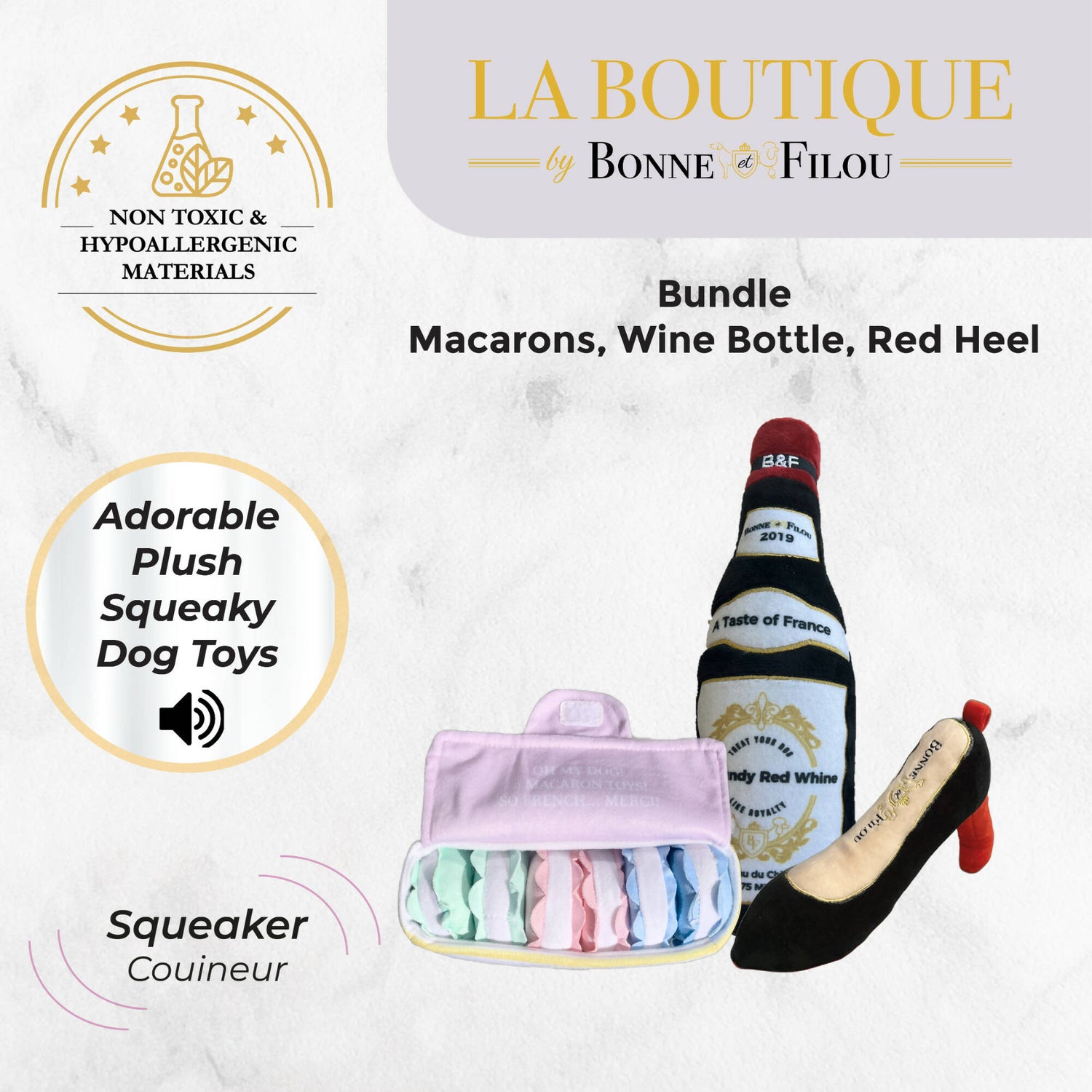 What do you get the dog that has everything? This unique gift set of 3 adorable, French inspired dog toys, of course! Each set includes: (1) Adorable, must-have box of multiple Plush Macaron Toys (each with their own squeaker) - perfect for the pampered-pup lifestyle! (1) Bottle of our exclusive Bark’gundy Red Whine (with squeaker) - every Pampered Pup should have their own whine bottle, don't you think? Santé (Cheers)! (1) Designer luxury shoe (with squeaker) - when you really want to impress, every pup knows there’s no better accessory than a plush luxury shoe squeaky toy. High fashion + high reward. Ultra Soft Recycled Material: Made from hypoallergenic and incredibly soft, high-quality recycled materials. Tons of Fun: Each plush toy contains a built-in squeaker protected by a layer of fabric to create endless hours of enjoyment! Unique and Fun Gift: These adorable toys are the perfect gift for any dog lover or dog birthday/puppy party. Materials: Safe and non-toxic materials for dogs 100% recycled materials Content: Polyester Fibers Care instructions: For best results when cleaning, either use a pet-safe detergent or avoid using detergent entirely. All toys can be surface washed with cold water and air dried