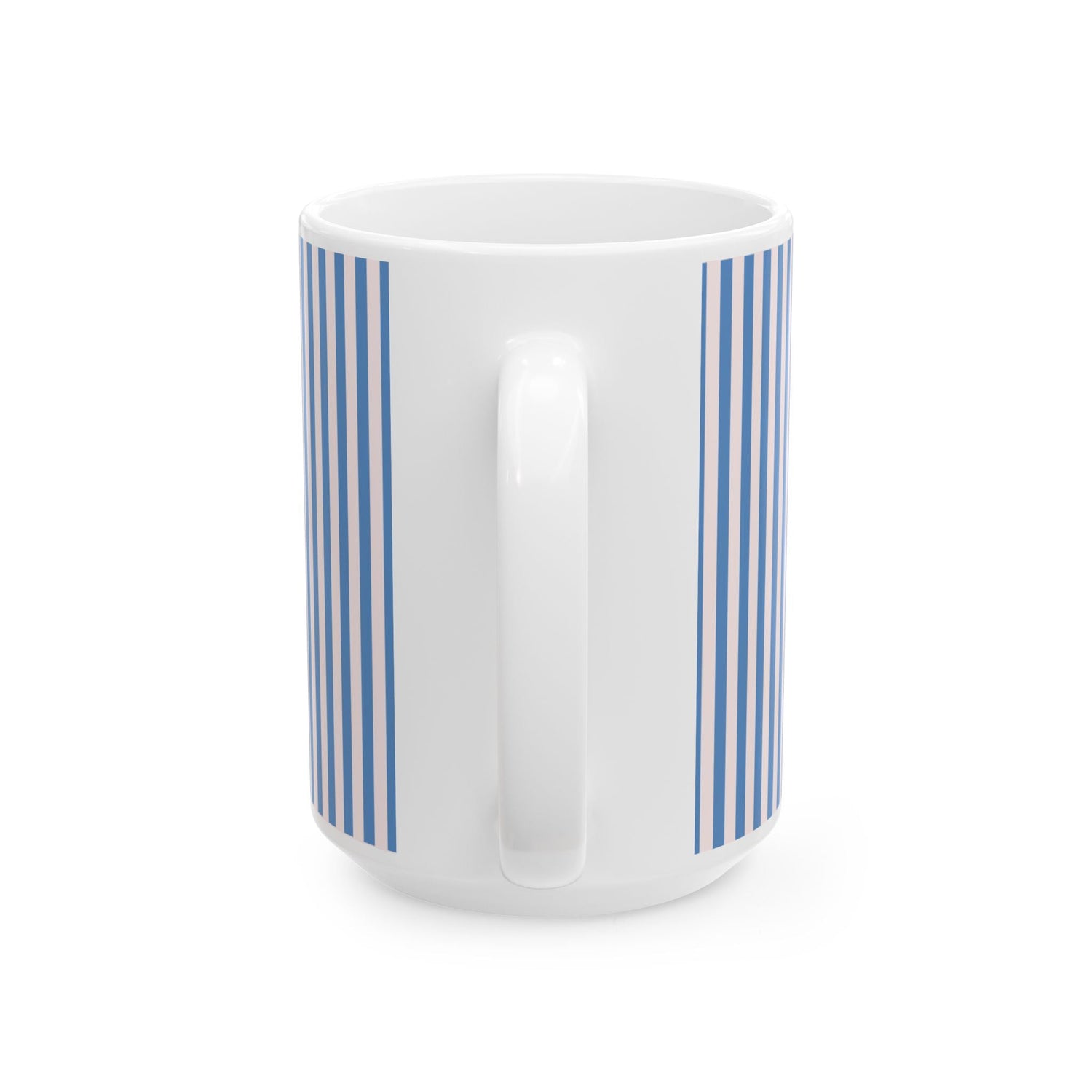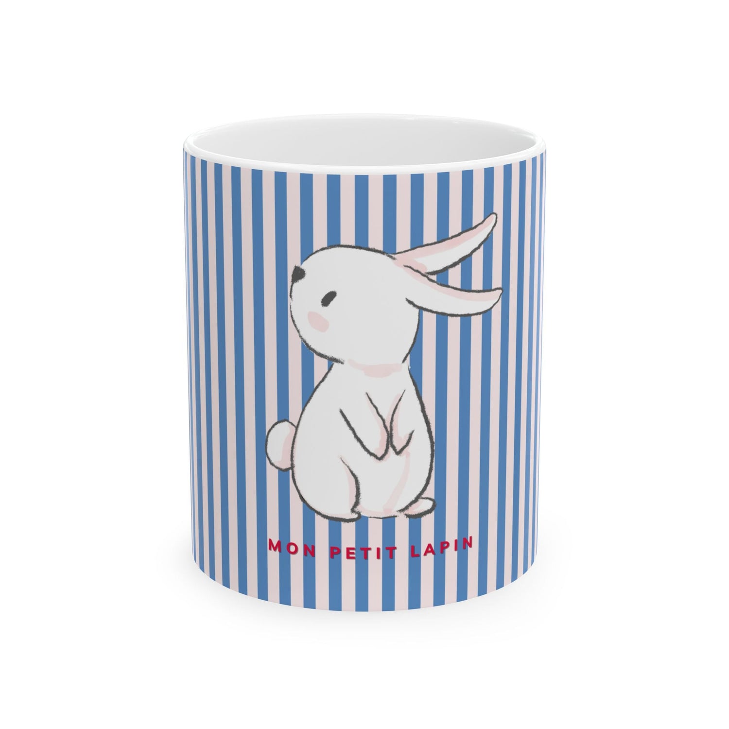 This sweet blue-stripped kids' cup features the adorable 'Mon Petit Lapin'. - My Little Bunny in French. Perfect for a whimsical and playful atmosphere, this mug is ideal for children's daily use or as a cute gift for little ones on birthdays, Easter, or any special occasion.