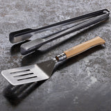 Made in France, the Opinel Grilling Set is ideal for outdoor grilling and over-the-fire cooking. This smart, robust, and efficient set features three premium utensils. The No.12B Stainless Steel Opinel folding knife is perfect for cutting meats, vegetables and fruits, and features a beech wood handle from sustainably managed French forests, equipped with a bottle opener at the end. The large Spatula+ is made of stainless steel and designed to insert into the knife handle and lock into place with the Virobloc locking ring. The stainless steel XL tongs feature a stonewashed finish and are long for convenient cooking over a grill, with notched tips and a grill lift built into the end of the handle.