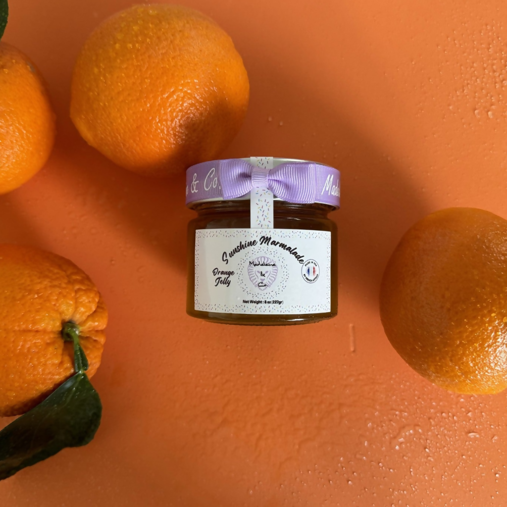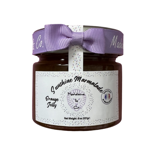 Madeleine & Co.'s Sunshine Marmalade captures the bright, zesty flavor of fresh Florida oranges, delivering a burst of sunshine in every bite. Crafted by a French artisan in the USA, this marmalade showcases the tangy sweetness of premium Florida-grown oranges, combined with a smooth, rich texture that elevates any dish.