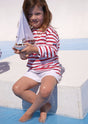 Easy to mix and match, this long-sleeve striped sailor shirt lends itself to a multitude of styles to brighten a child's day: Blue and white for little sailors, with a tulle skirt for dancing princesses, worn even with the motley colors of a clown costume....the possibilities are endless.