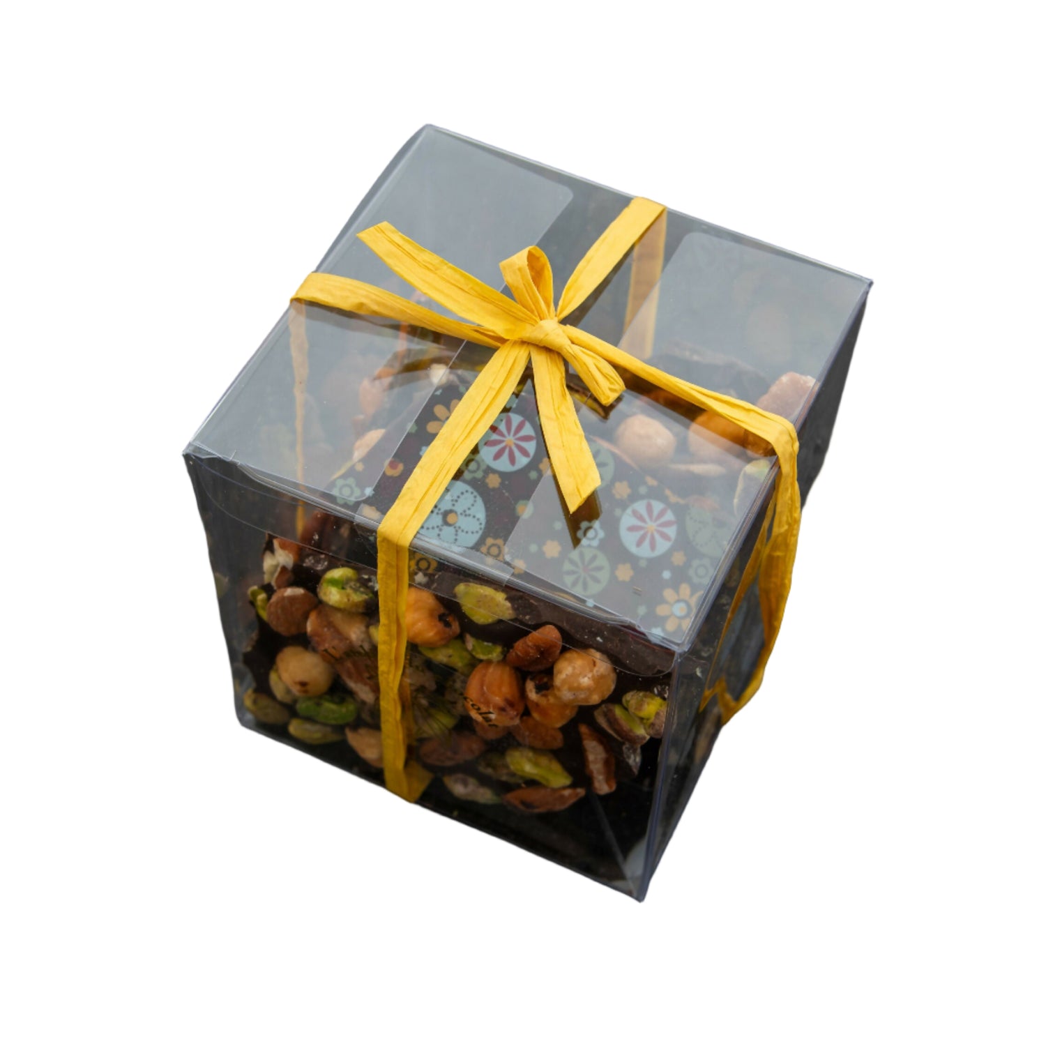large pieces of chocolate bar with mixed nuts (Almond, Pistachio, Pecan, Hazelnut) - no fruits -available in dark or milk chocolate
