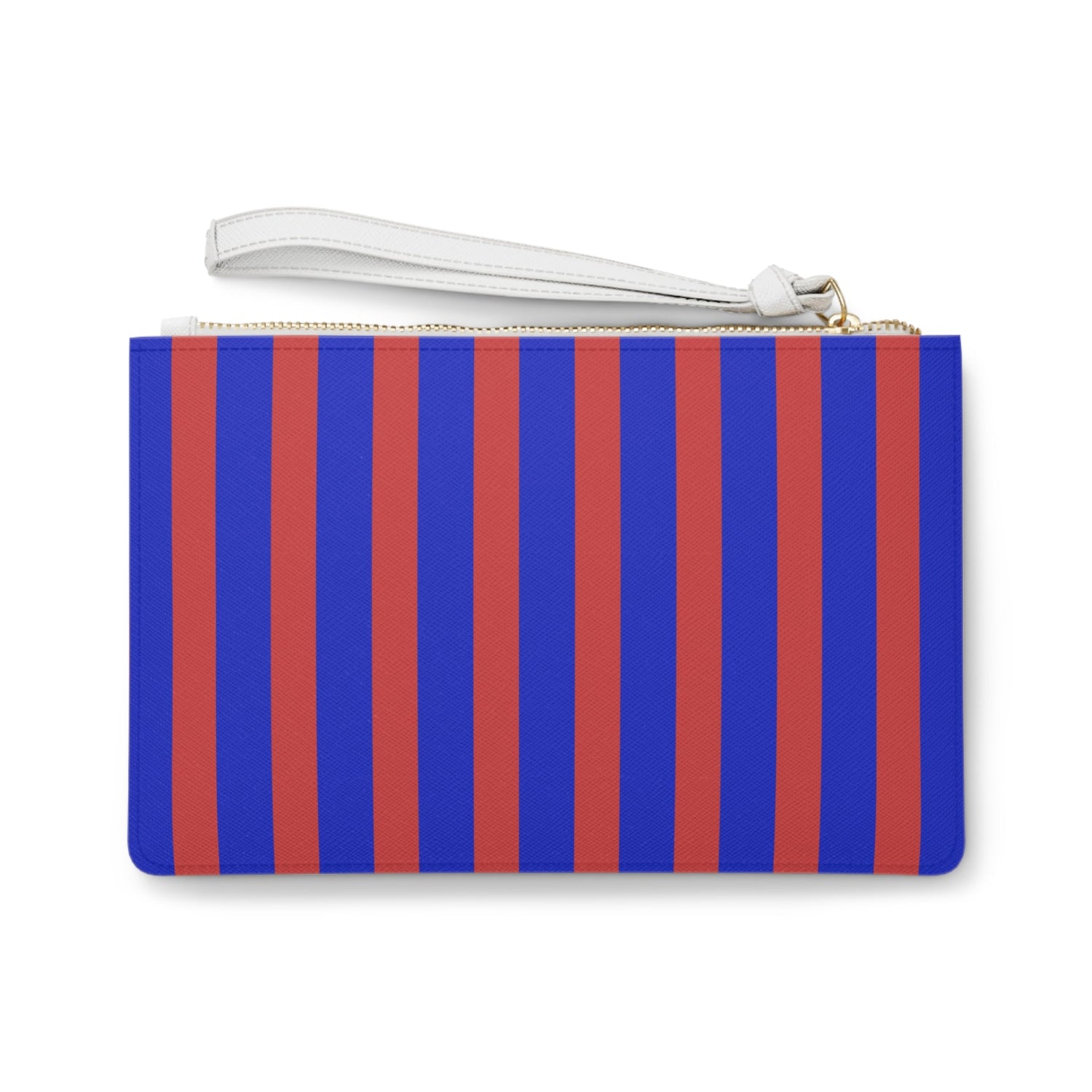 A bold striped clutch with a Parisian whisper - PARIS VIBES Spark Joy. Slim and structured, its bold electric blue and red stripes read like a seaside promenade—confident yet easygoing. The gold metal zipper and white wrist strap add a touch of polish, while the textured PU leather holds its shape and resists scuffs. Inside, a black-lined interior, two compartments and a small pocket keep cards, phone and lipstick organized for evenings out, markets, or a quick coffee run.