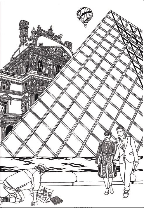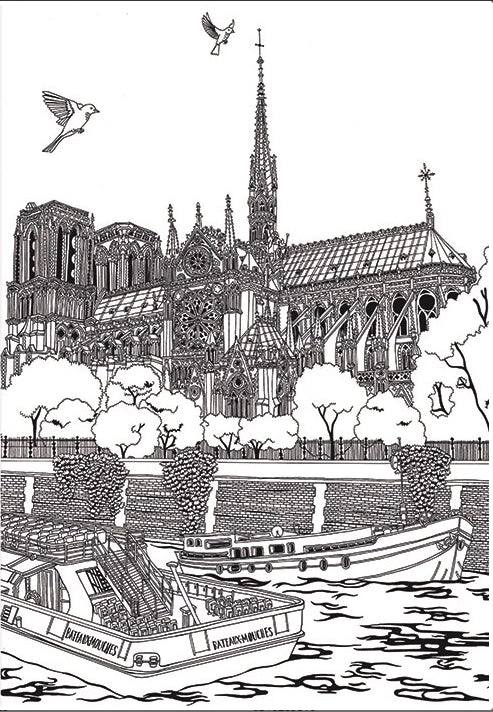 Created by London-based illustrator Hennie Haworth, Color Paris showcases both iconic landmarks—like the Eiffel Tower—and lesser-known gems, such as the bustling Brasserie Lipp and the modern Philharmonie de Paris. Each detailed black-and-white drawing captures the essence of Paris, with Haworth’s charming retro style highlighting the city's distinctive quirks and atmosphere.