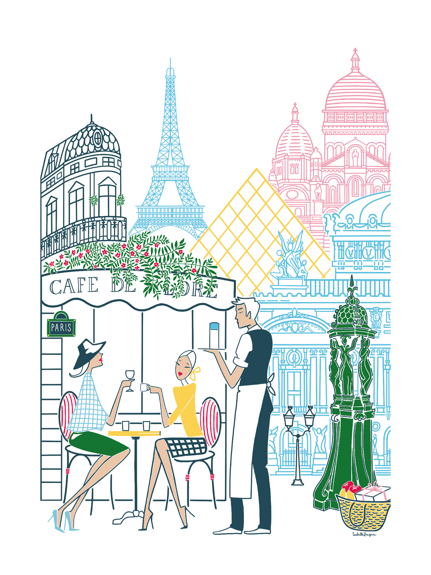 Poster of a cute illustration “Les Parisiennes” featuring the iconic Cafe de Flore and the Eiffel Tower