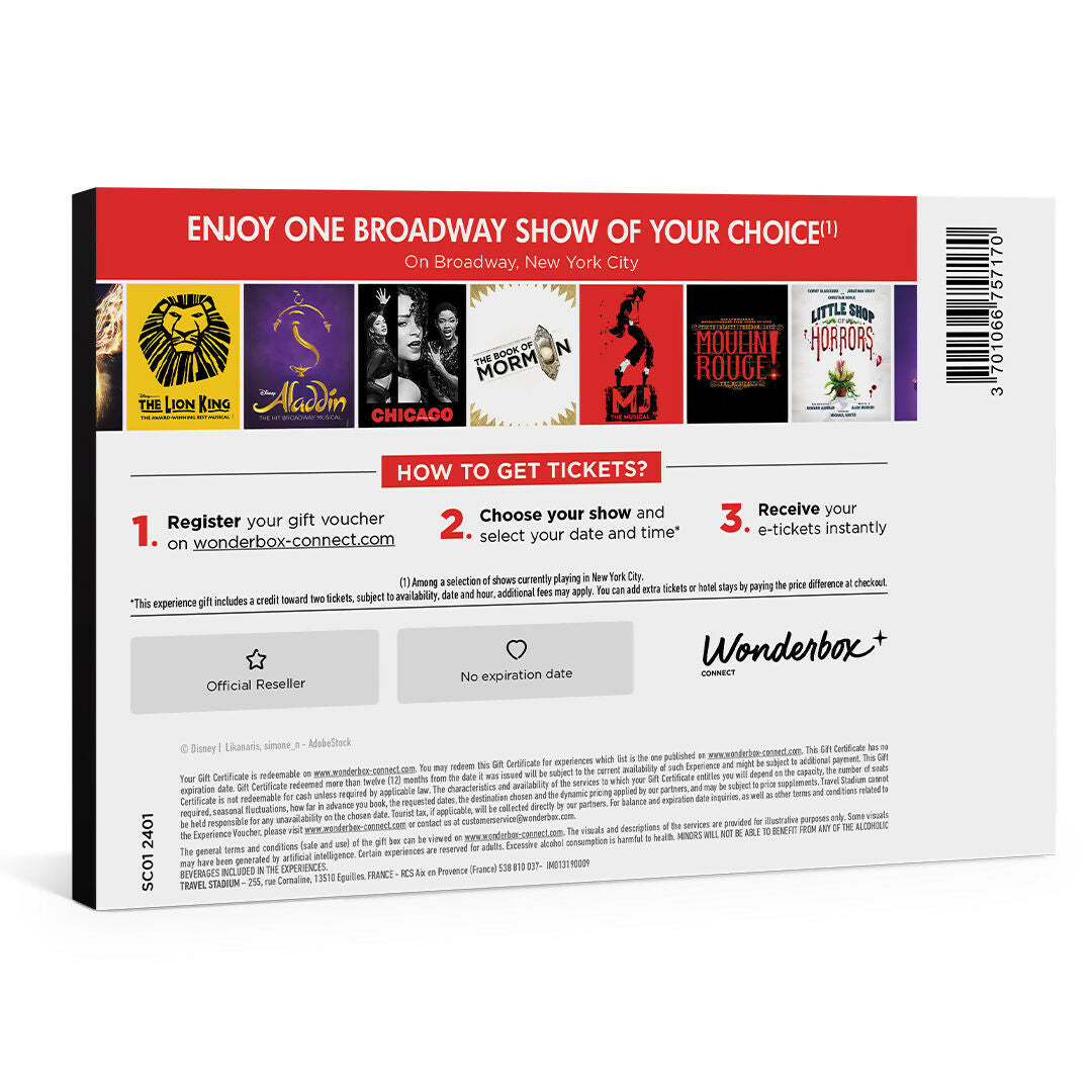 Inside our Experience Gift Box: 2 open tickets to experience the magic of Broadway show of your choice! Whether it's a timeless classic or a new hit, gift the magic of a Broadway show in the heart of New York City, a gift of unforgettable entertainment, perfect for anyone ready to be swept away by powerful performances!