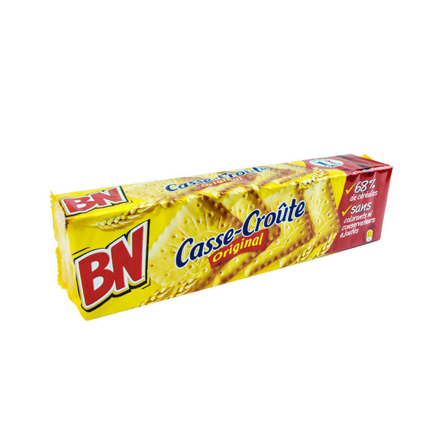 Details Since 1922 BN produces the Casse-Croûte : a crispy biscuit containing 68 % of cereals. It is the perfect match between a sweet and well-balanced breakfast or an ideal teatime for authentic food addicts. Did you ever taste it with butter, jam or simply soaked in a cup of milk ?