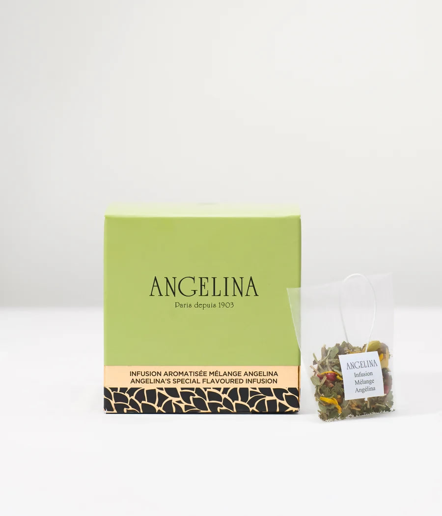 The  “Mélange Angelina”, made the traditional French way, is a unique infusion mixing cocoa beans flavors, pieces of chocolate and spices.