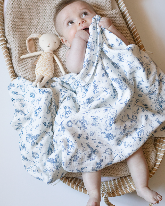 Bonjour, little ones! dreamland awaits you with our incredibly soft & gentle ‘rêverie’ cotton blanket. the elegant storytime toile print will add a touch of whimsy to everything from naptime snuggles to afternoon play dates & beyond. this multi-purpose blanket can be used in the nursery or when on the go—the breathable & lightweight material is perfect for nursing, cuddling, & even blocking out the sun during your next sunny stroll.