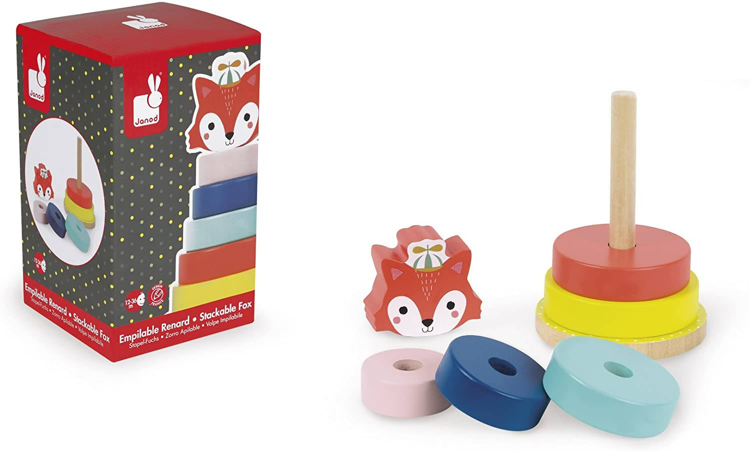 - Janod Baby Forest Fox Wood Stacker Toy features vibrant colors and stackable rings with fox topper.