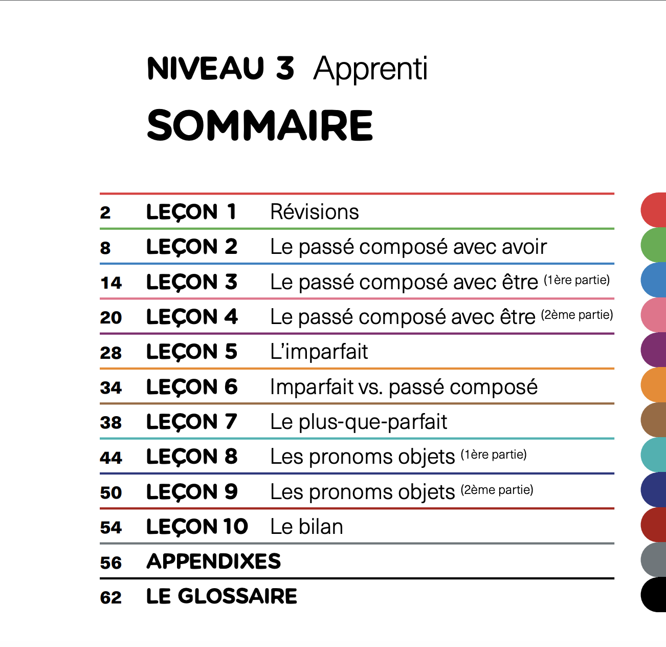 Apprenti (Level 3), we learn about all the different past tenses (passé composé, imparfait, plus-que-parfait), as well as object pronouns.