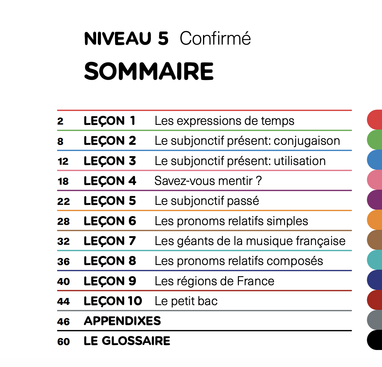 In Confirmé (Level 5), we practice conversation, learn about the subjunctive and relative pronouns.