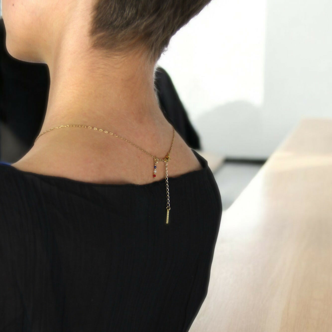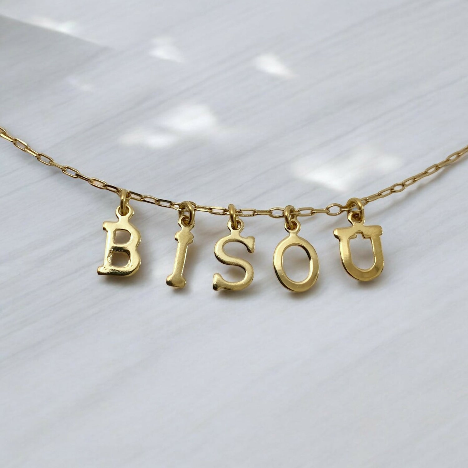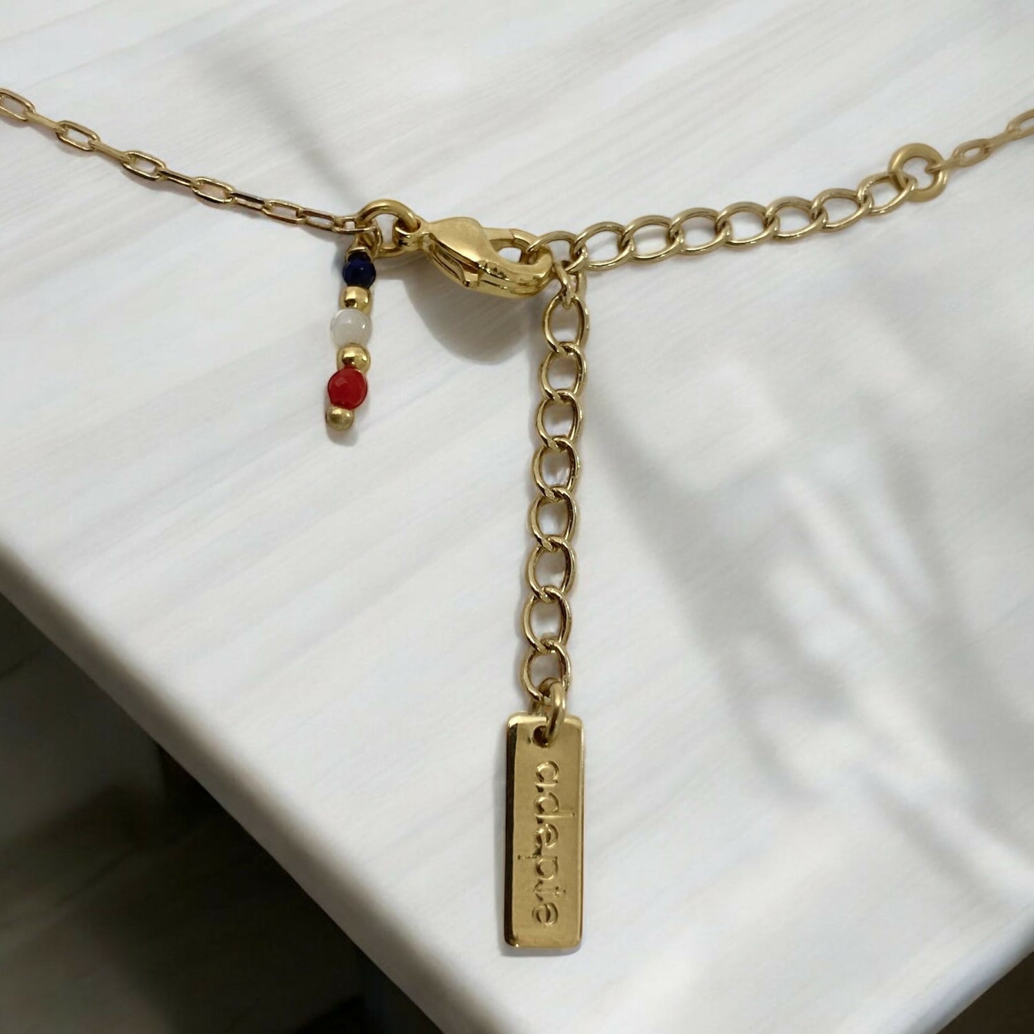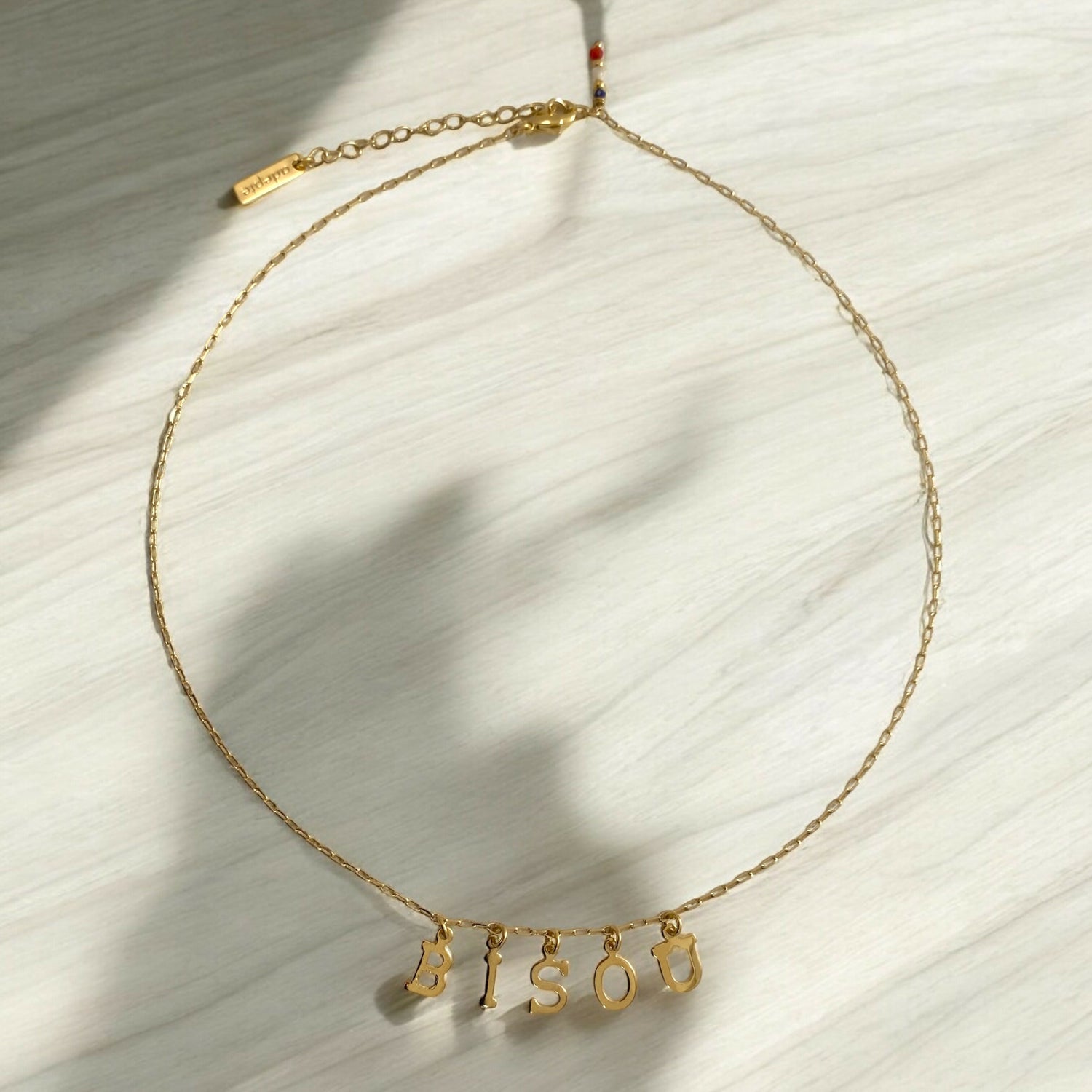 Add a playful French twist to your jewelry collection with our Bisou Love Charms Necklace. “Bisou,” the French word for kiss, makes this necklace both charming and romantic. Each golden letter dangles delicately from a fine chain, forming a joyful statement that celebrates affection with a distinctly French touch. Discreetly placed at the back of the necklace, a red, white, and blue bead charm evokes the French flag—an elegant reminder of its origin.