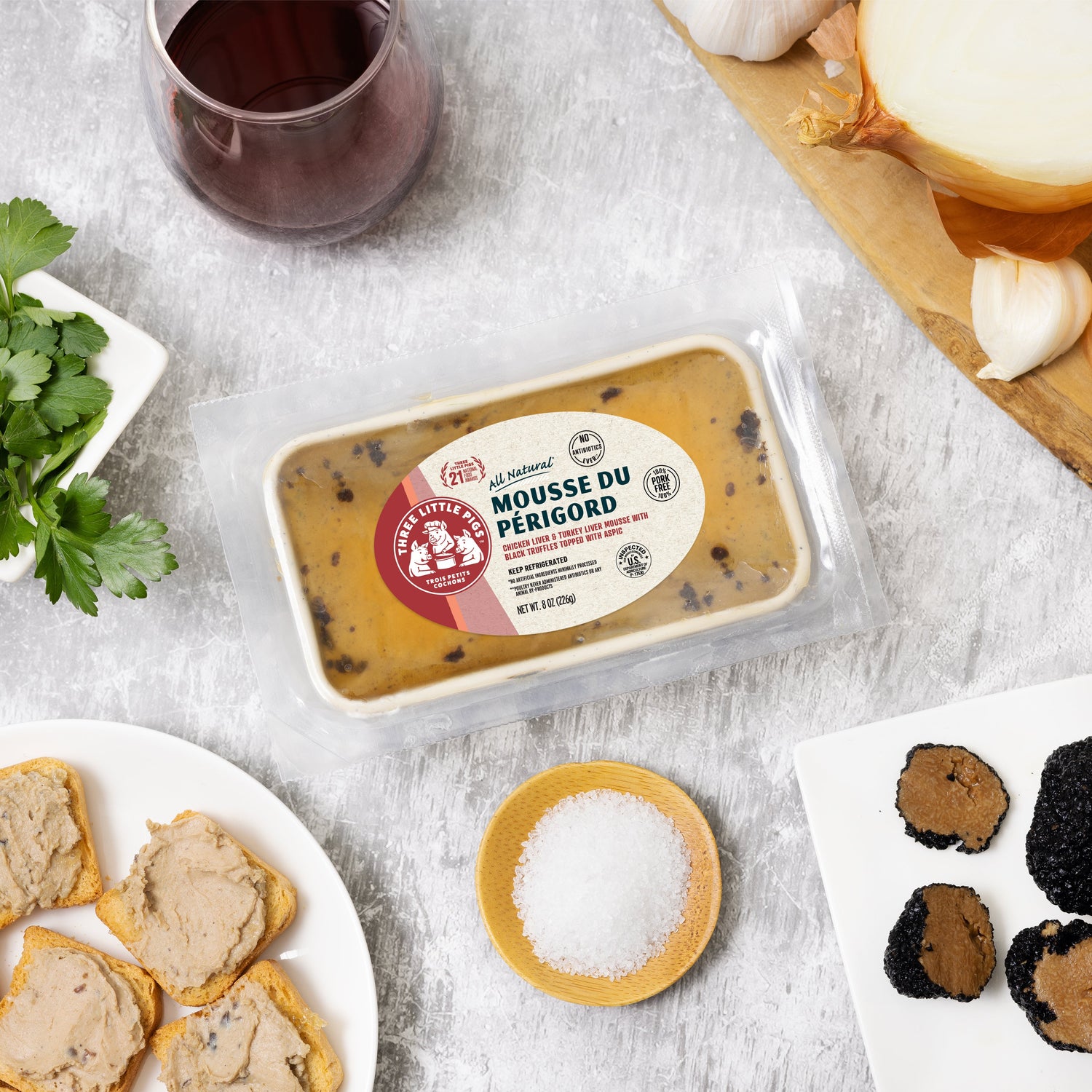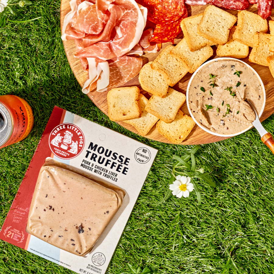 The secret to hosting a great party is Three Little Pigs signature Get the Pâté Started Charcuterie Kit, featuring an exquisite selection of coarse cut and creamy mousse pâtés. With a variety of flavors like Mousse Truffée, Mousse de Foie de Canard au Porto, Pâté de Campagne, and Mousse du Périgord this irresistible spread is certain to set the perfect tone for any gathering.