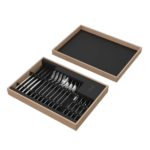 16-Piece set includes 4 place settings. 4x Table Knife, 4x Fork, 4x Tablespoon, 4x Teaspoon. Designed in France. Made in Portugal.