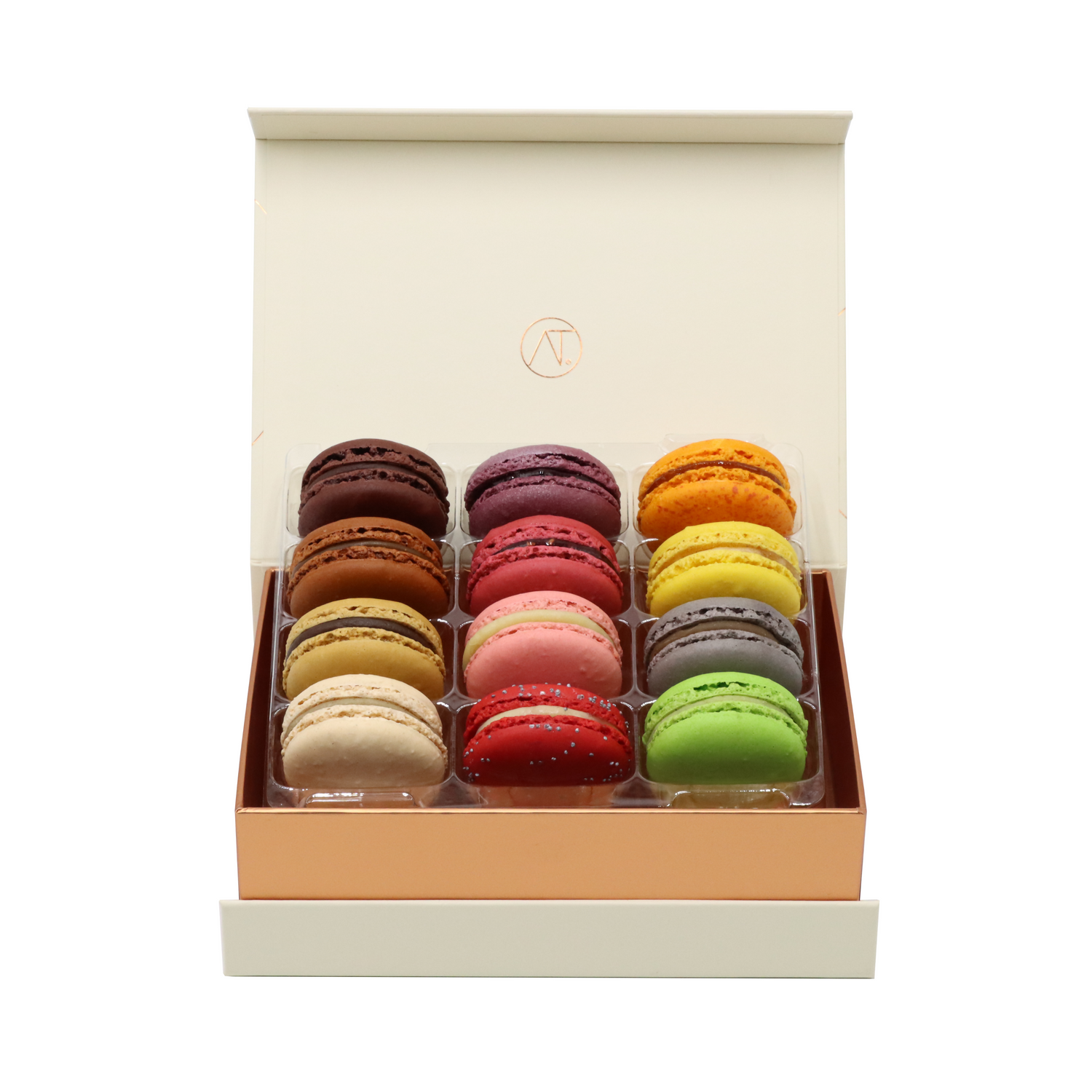 Packaging: Assortment box containing 12 macarons (one of each flavor).