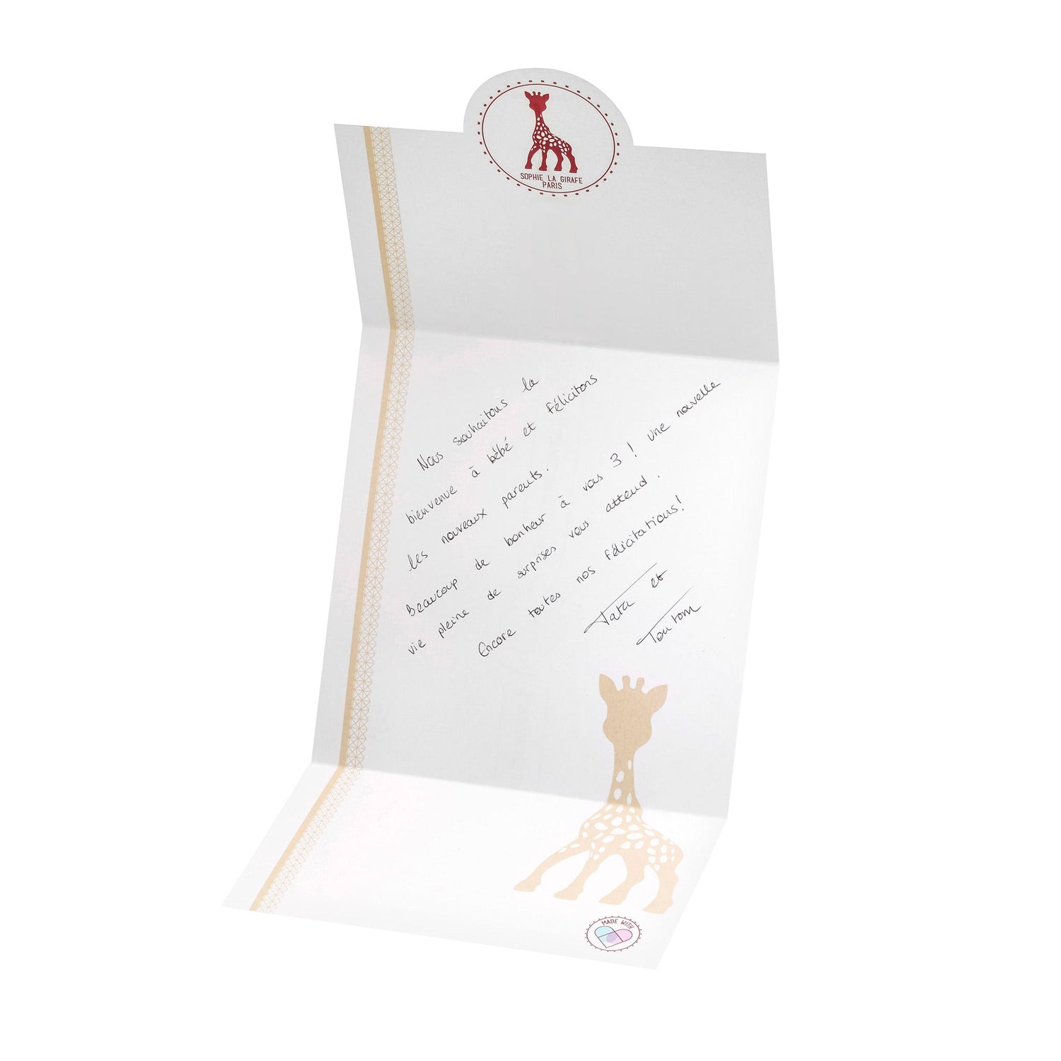 All “Sophisticated” sets include: a Sophie la Girafe + a rattle with beads + a bag + a gift card