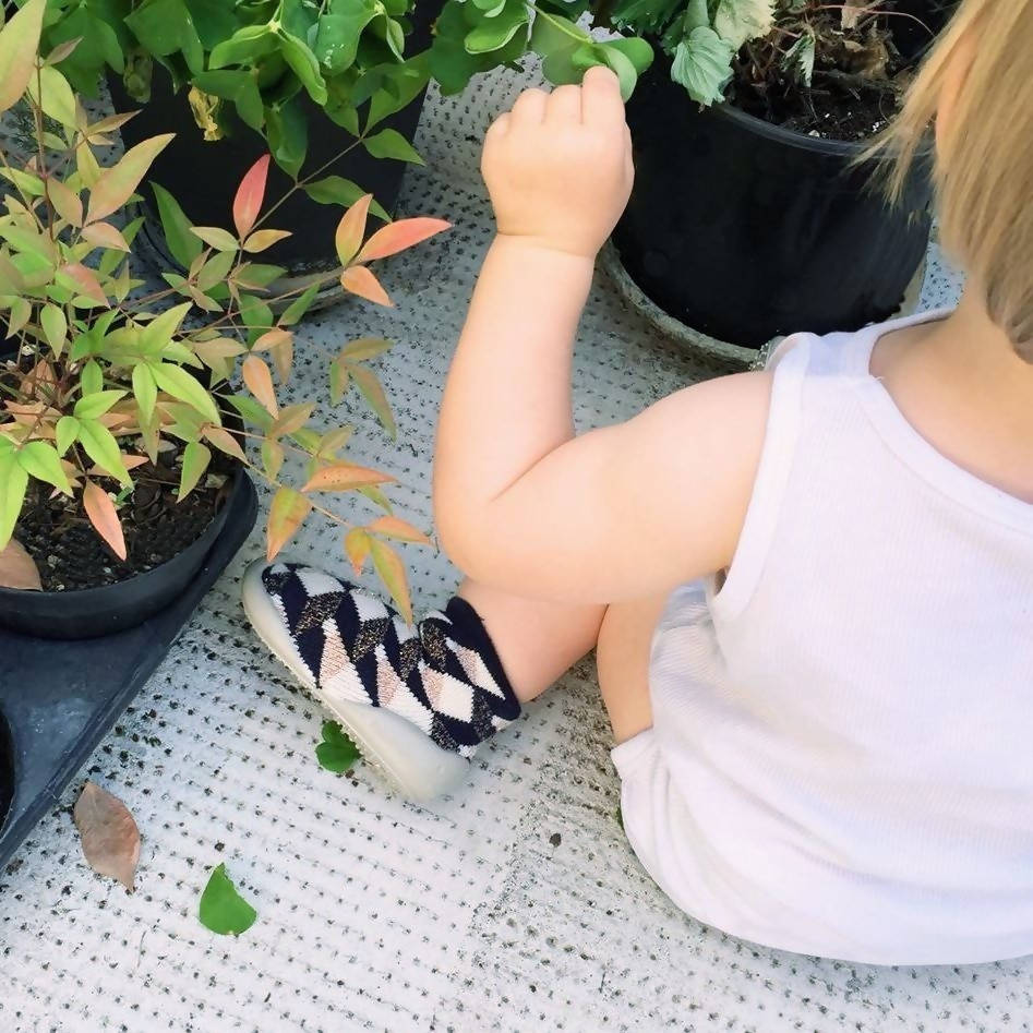 With the softness of a sock and the comfort of a slipper, these indoor shoes are kids essential. The sole is soft and comfortable, perforated breathable and with non-slip spikes. Beautifully designed, they will help your little one with balance and will keep the feet warm and not slippery.