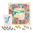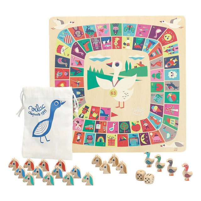 A reversible wooden game box containing the classic games of goose and little horses illustrated by Ingela P.Arrhenius and her vintage and retro universe.