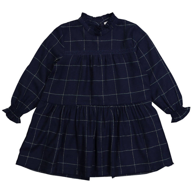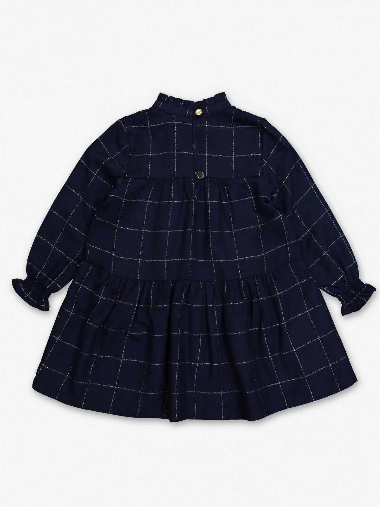 This elegant baby girl dress with lace is designed with gold lurex thread. It features a high ruffled neckline and button closures to the back. Wear it with tight, ribbed or plain. Such an elegant outfit!.