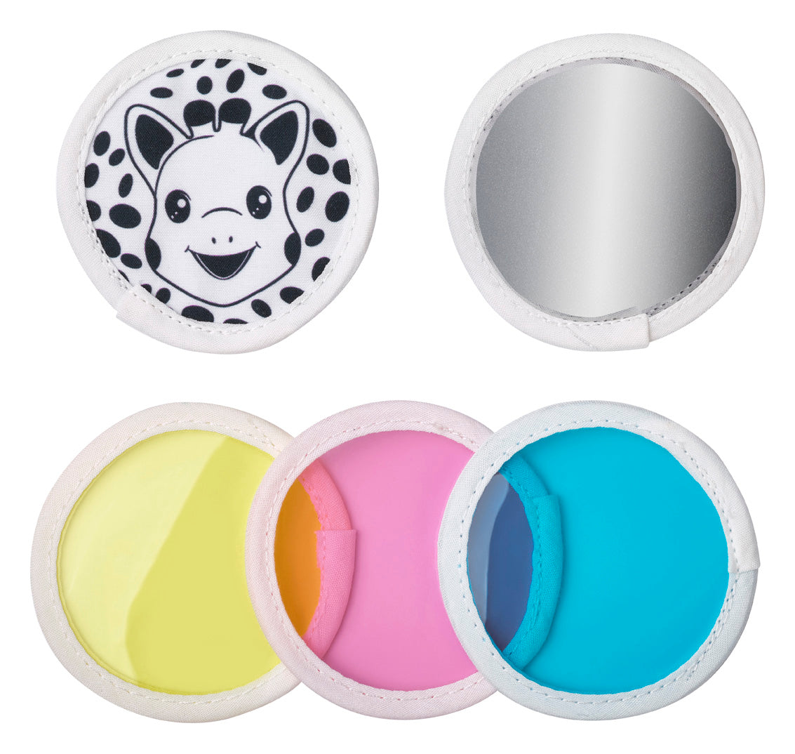 Equipped with several interchangeable lenses, this evolving mirror is ideal for developing baby's sense of sight! From birth, baby discovers black and white contrast and his reflection in the mirror. Then, baby will have fun discovering the world in pink, blue or yellow through the 3 transparent lenses. The mirror frame is made from natural rubber.