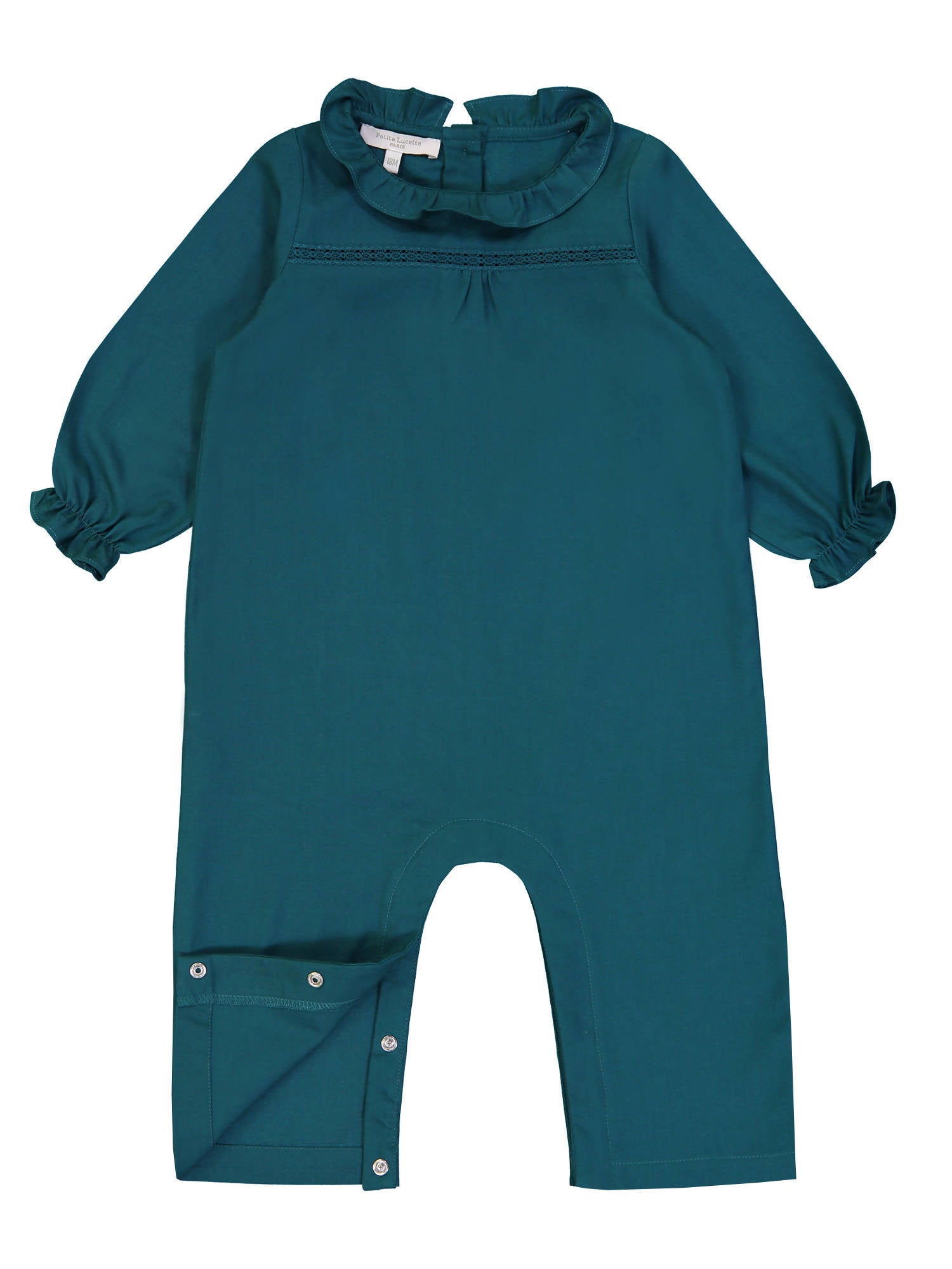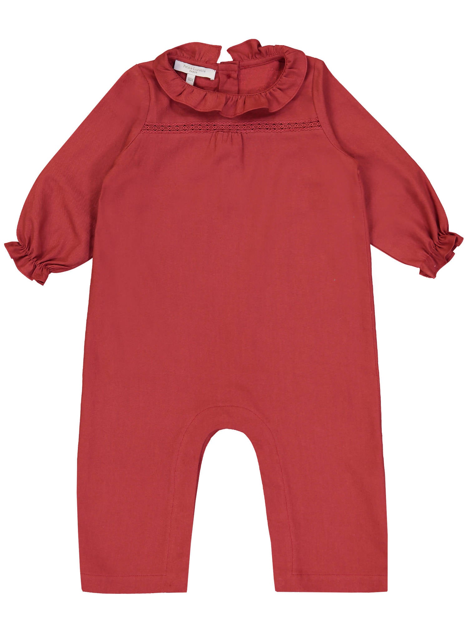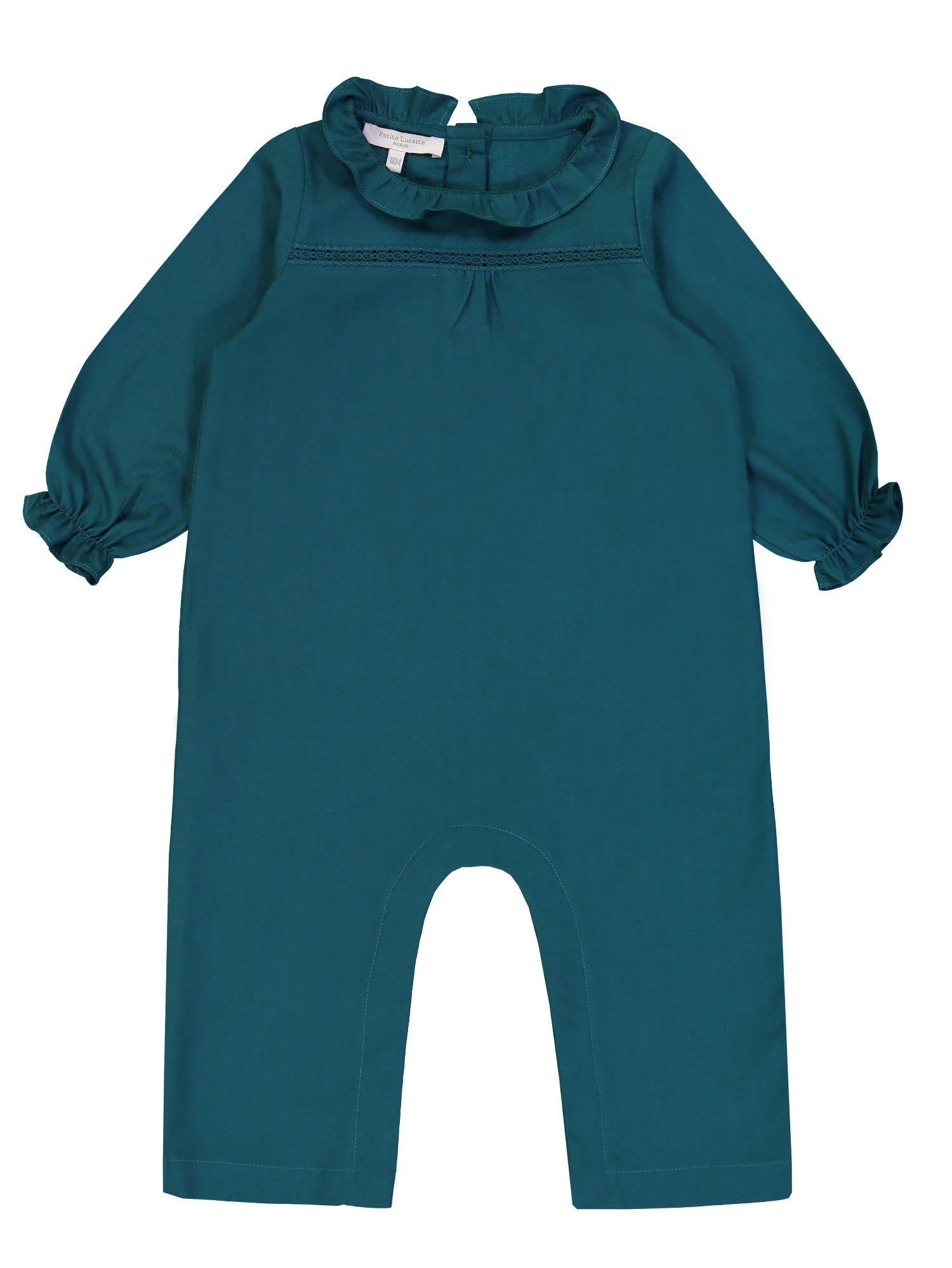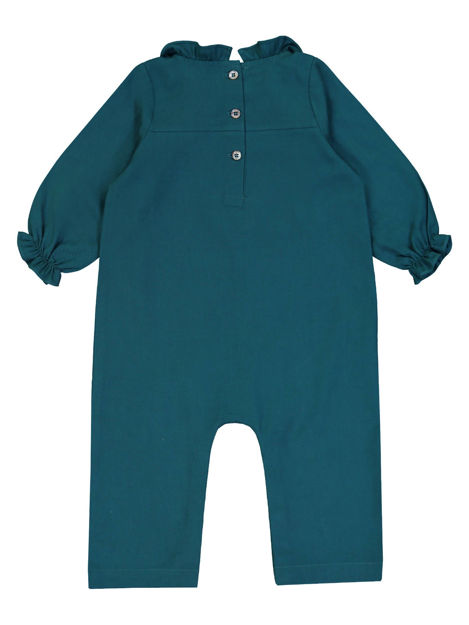 Crafted in soft cotton flannel, this overallĀ includes elasticated cuffs and a ruffled collar. For winter, this color is jolly and easy to wear.