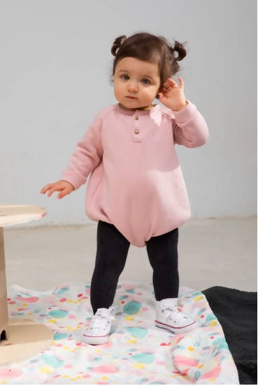 We love this soft and warm romper ideal to wear all season long with tights. Easy snap closures fasten on the front and between legs.