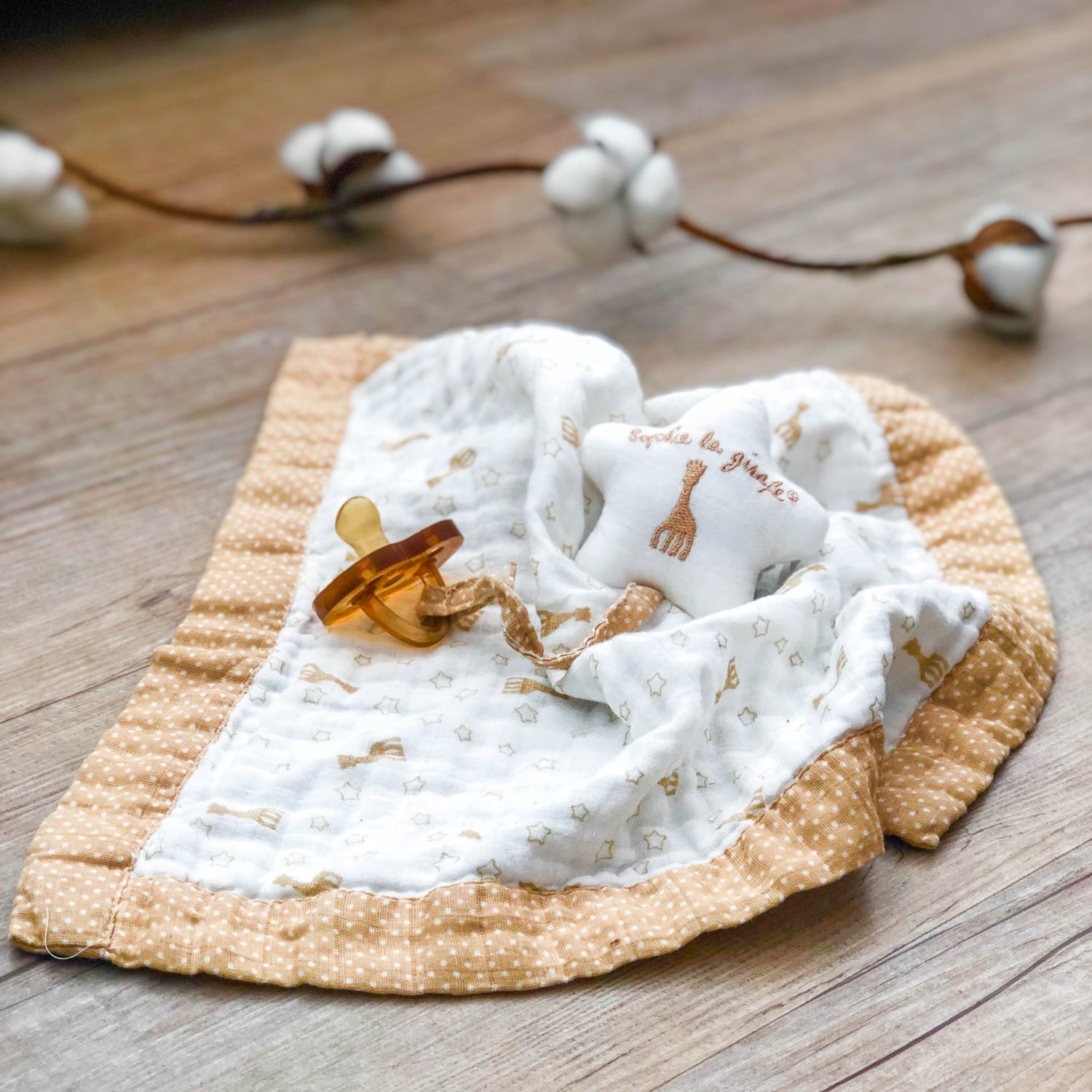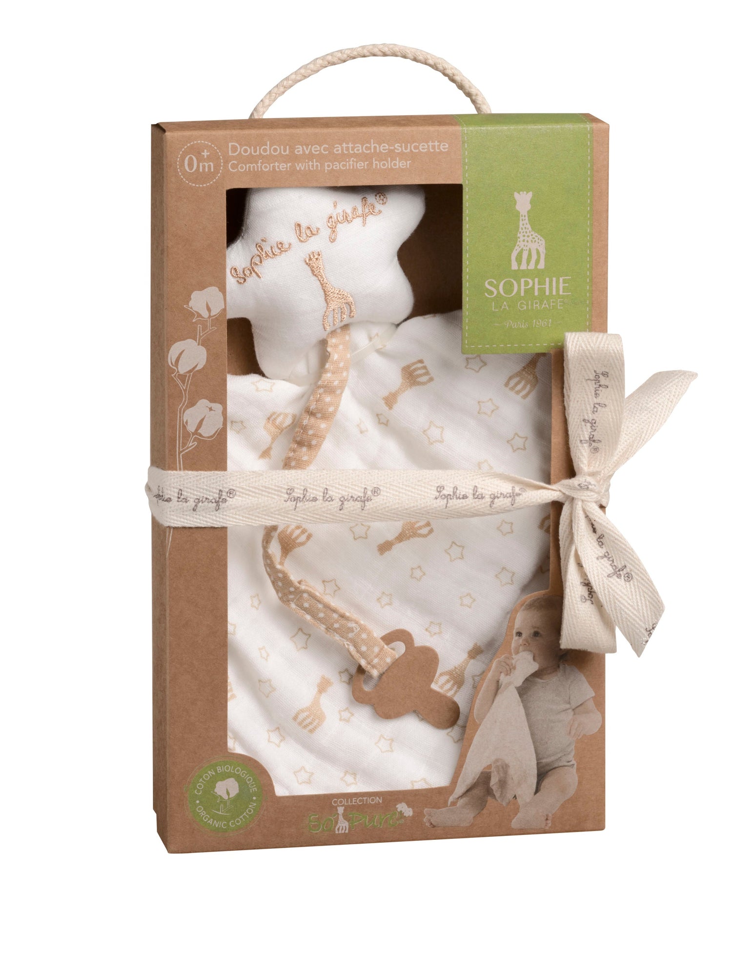 Sophie the Giraffe So'Pure Star Comforter and Lovey Pacifier Holder is made with natural materials (ORGANIC cotton and corn fibre), this soft comforter with pacifier-holder will be baby's day and night companion. For every peaceful and affectionate moment.