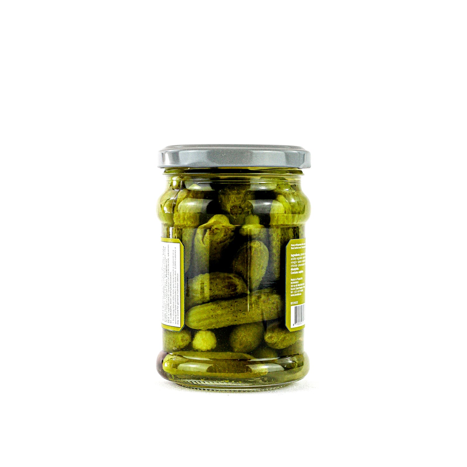 Gherkins, water, salt, acidity regulator: acetic acid, vinegar, spices, preservative: potassium disulfite (sulphites).