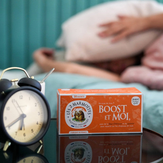 Need a natural pick-me-up? Les 2 Marmottes' Boost et Moi infusion is your go-to energizer. This vibrant, caffeine-rich blend combines the tangy brightness of hibiscus (30%) with the fruity depth of rosehip, the zesty warmth of ginger, and the invigorating power of guarana (15%). Complemented by lemon balm, ginseng, and eleutherococcus, it delivers a bold, revitalizing experience to help you power through your day.