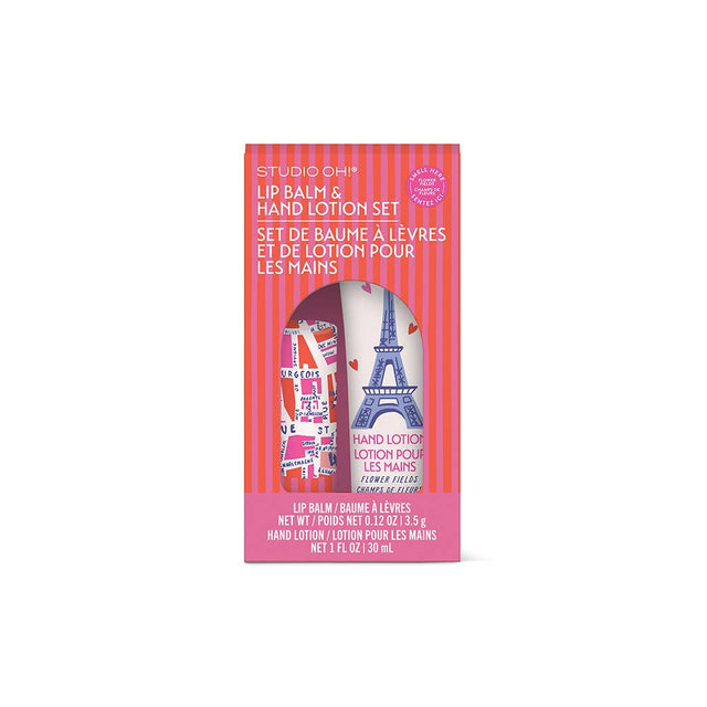 The Lip Balm Hand Lotion Set includes a 1 oz hand cream and lip balm packaged in a gift-able box.