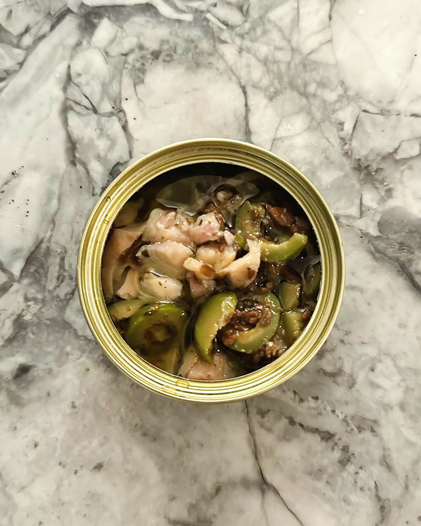 Fillets of Branzino canned with carefully prepared ingredients: sliced castelvetrano olives • kalamata olives, toasted and smoky • olive oil • herbs • salt.