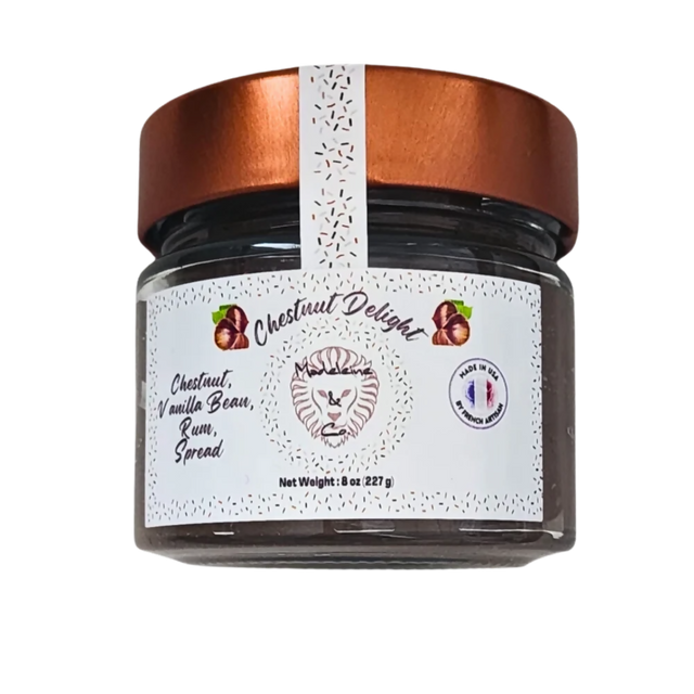 Our Chef Corinne Ouelhadj Engel has crafted this velvety chestnut cream is infused with the warm, comforting flavors of vanilla and a subtle touch of rum, offering a unique and indulgent experience. The smooth texture and rich flavor profile make it the perfect addition to your breakfast, desserts, or as a luxurious treat all on its own. Carefully crafted with the finest ingredients, Chestnut Delight is a true tribute to traditional French craftsmanship, blending the sweetness of chestnuts with a hint of rum to create a perfectly balanced and unforgettable spread. It pairs wonderfully with a croissant, crêpe, bagel, bread, or crackers. It's also delicious stirred into oatmeal or yogurt or simply enjoyed by the spoonful for a pure moment of indulgence.