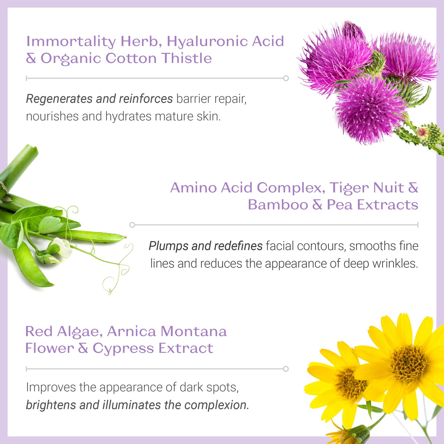 Ideally suited for mature skin that has been affected by hormonal changes. Powered by 20 unique actives to recode youthfulness and revitalize the complexion. Empowered by immortality herb, avocado and grape seed oils, shea butter, hyaluronic acid, thistle, and red algae extract, this revolutionary treatment regenerates and restructures the skin's outer layers, firms and evens coloring. With the pleasure of a smooth and comfortable texture, the elegance of a unique age exception scent, and the luxury and cleanliness of premium air tight packaging, this multi-patented cream is truly the gold standard of anti-aging skincare.