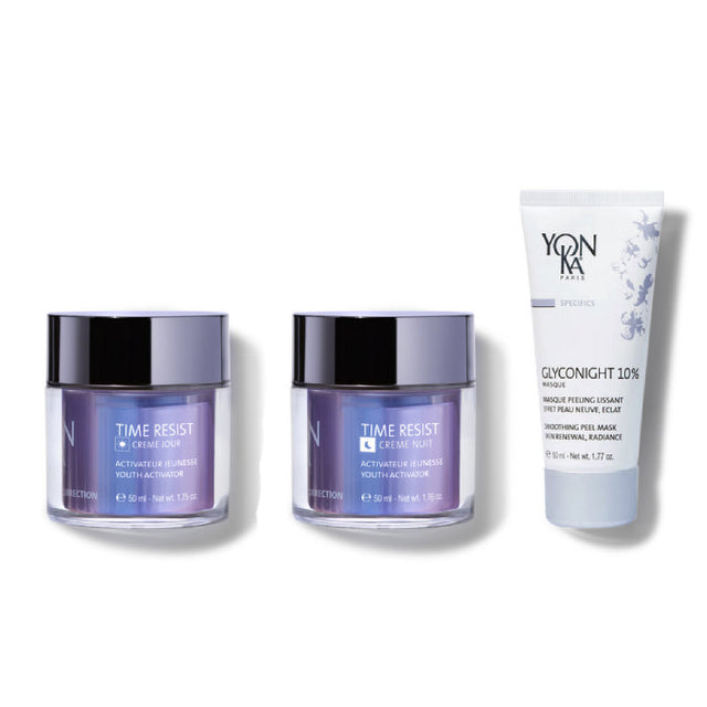Boost your skin’s natural radiance around the clock with our simplified, 3-piece anti-aging ritual. Yon-Ka’s youth-enhancing ritual defends your complexion from multiple signs of aging throughout the day while increasing cell turnover and re-energizing fatigued skin at night..