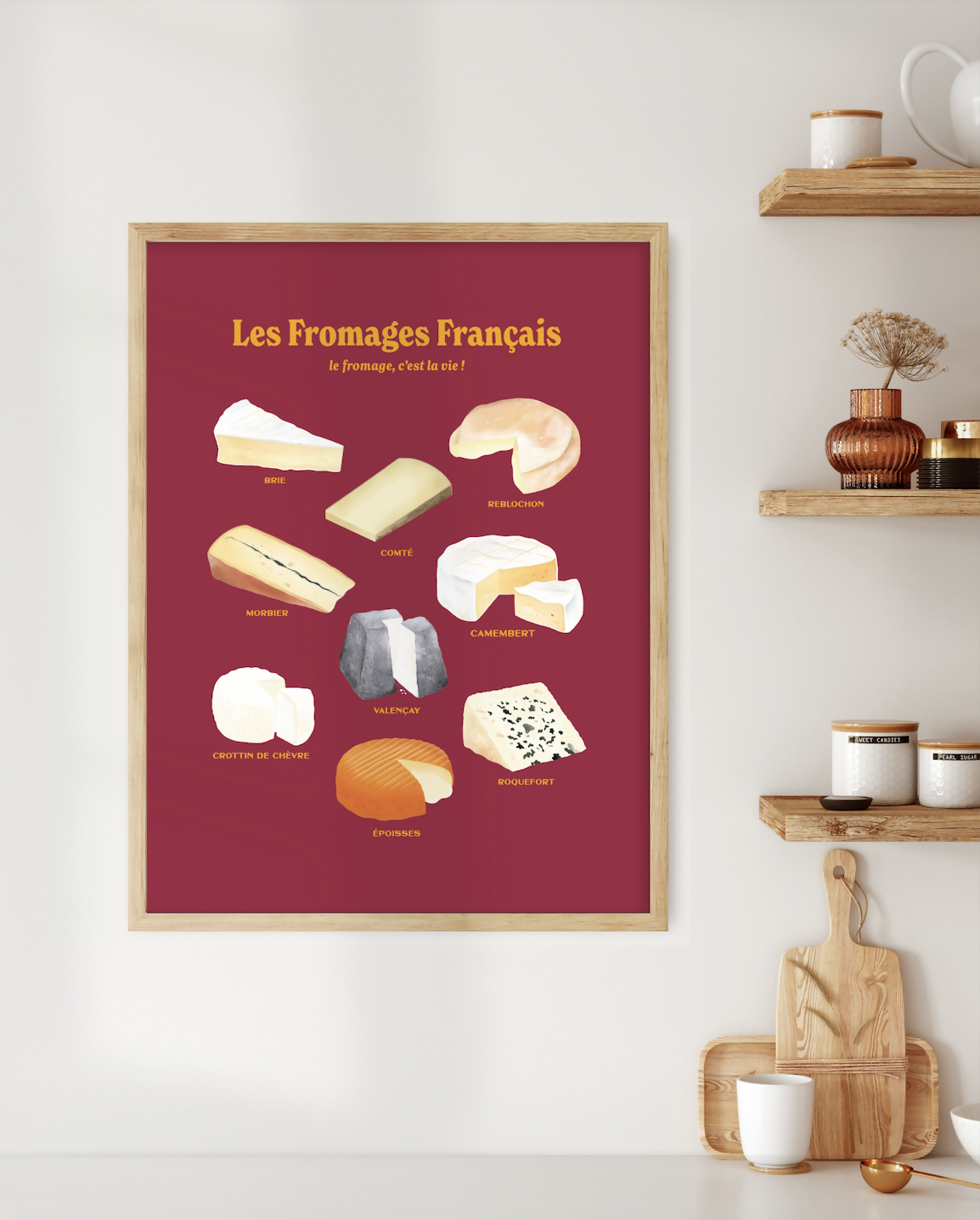 • Bring the delicious world of French cheeses to your walls with this vibrant poster illustrated by French artist Maïlys Huby. It celebrates iconic French cheeses like Brie, Reblochon, Comté, and Époisses in a colorful and playful design.