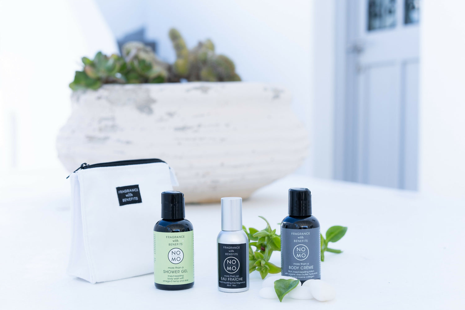 Our elegant Eau Fraîche, Shower Gel and Body Crème come in a TSA- approved, reusable pouch for easy traveling. A long weekend is calling you, so grab your NoMo and go.